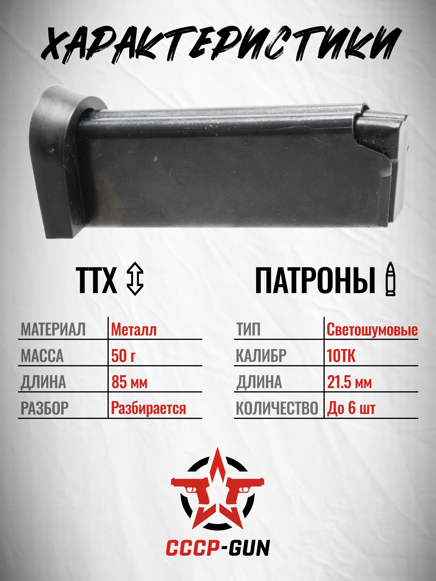 Магазин для охолощенного пистолета Валера. Магазин коробчатого типа. Ёмкость аксессуара - 6 мест. Калибр - светошумовой патрон 10ТК.