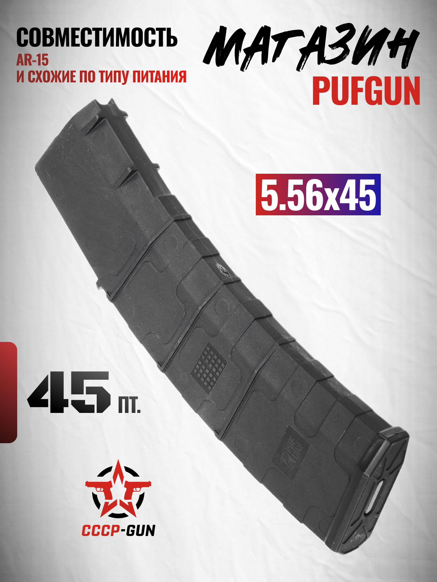 Материалом для изготовления образца PufGun послужил ударопрочный полиамид в темном оттенке. Помимо повышенной прочности, указанное сырье способствует уменьшению веса изделия - масса магазина составляет 180 граммов при полной длине, равной 270 миллиметрам.