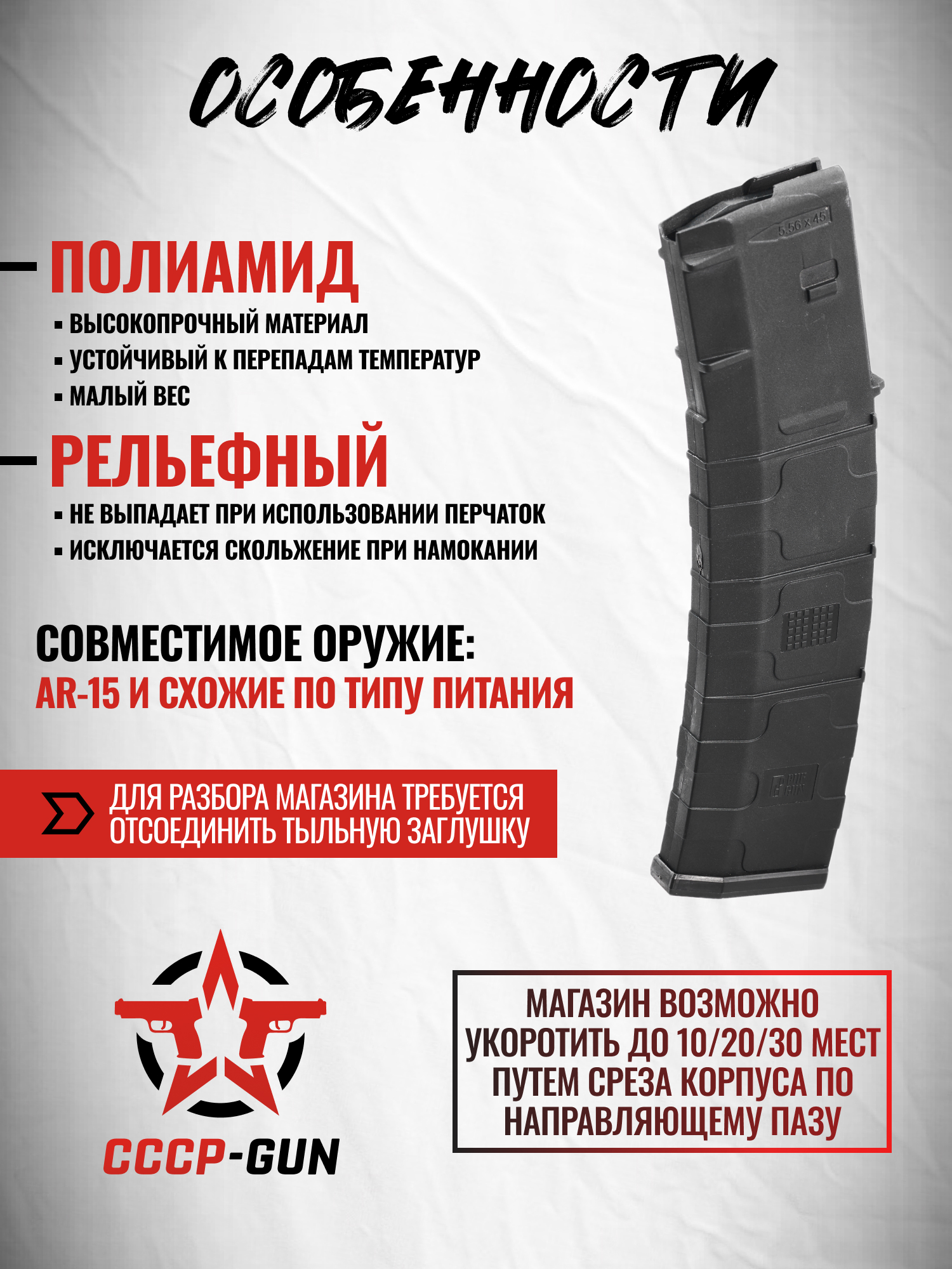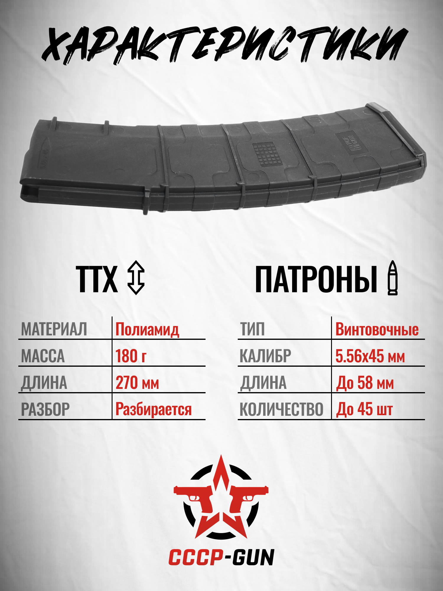 Главной отличительной чертой модели от PufGun выступает емкость - в обозреваемый AR магазин помещается до 45 патронов. Конструктивное исполнение при этом сохранило двухрядную схему, ввиду чего экземпляр не уступает штатному в плане надежности функционирования.