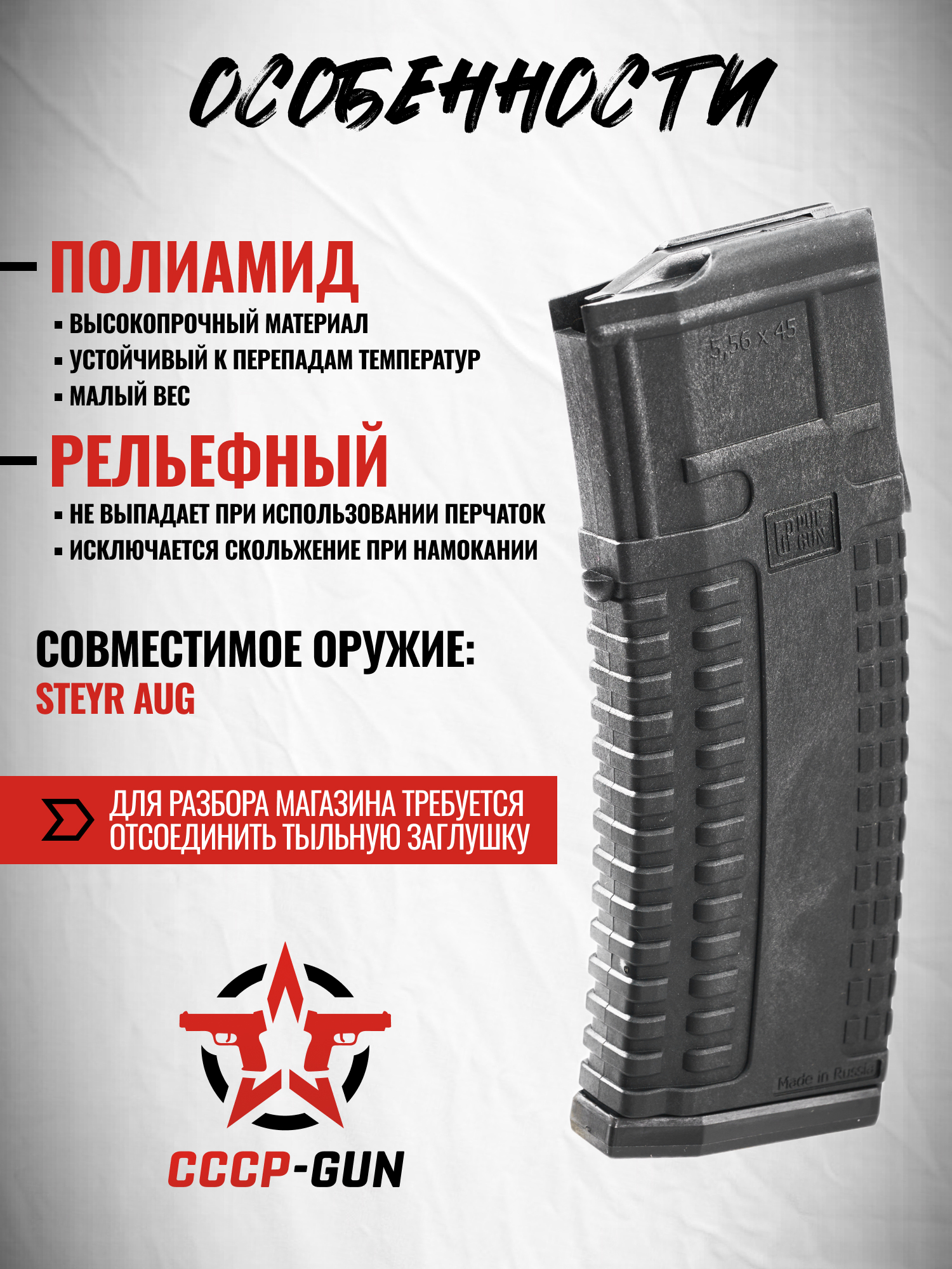 Обозреваемый магазин Пафган разработан специально для использования с автоматами AUG. Модель в полной мере совместима с особенностями австрийской платформы Булл-Пап компоновки.