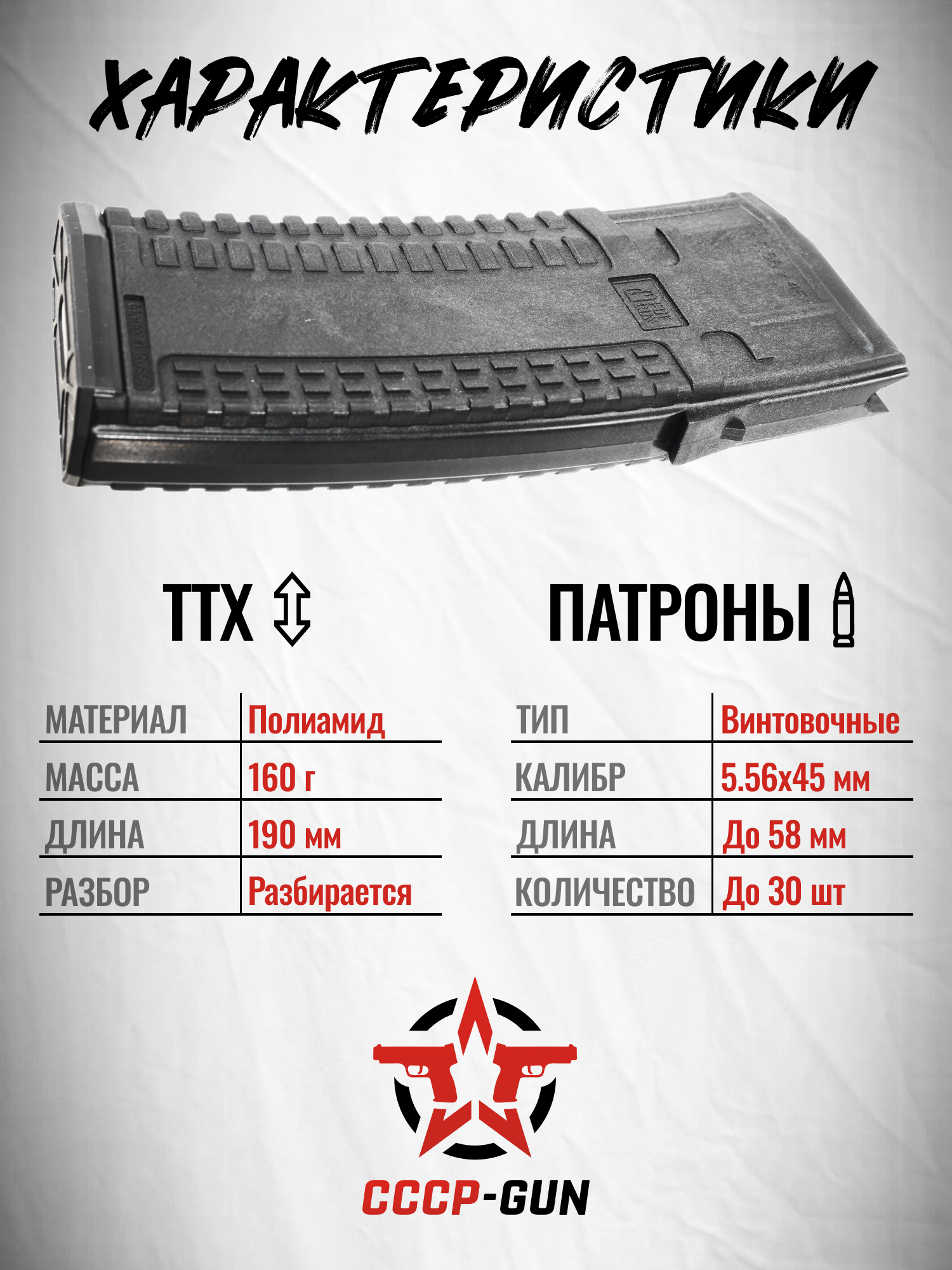 Экземпляр рассчитан под патроны стандарта НАТО калибра 5.56x45 мм. Его вместимость составляет 30 боеприпасов длиной до 58 мм. Тыльная крышка изделия легко снимается для проведения обслуживания модели и ее отчистки от загрязнений.