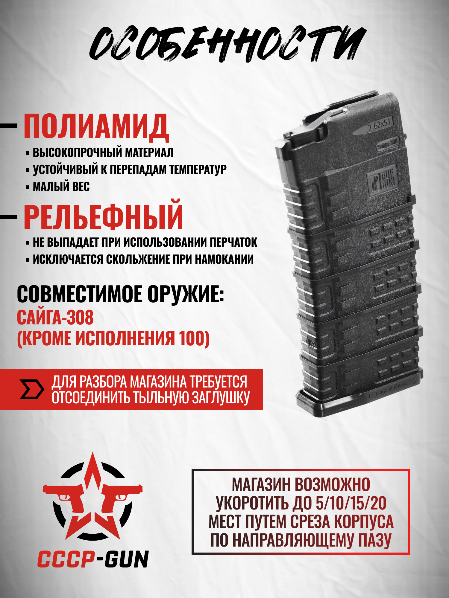 Увеличенный магазин на Сайгу выполнен из прочного черного пластика, невосприимчивого к деформациям после падений. На стенках предусмотрены направляющие, которые позволяют изменить габарит экземпляра - при необходимости владелец может укоротить изделие, срезав нижнюю часть корпуса и закрепив тыльную крышку выше. Это адаптирует модель под задачи, которые требуют компактной конфигурации.