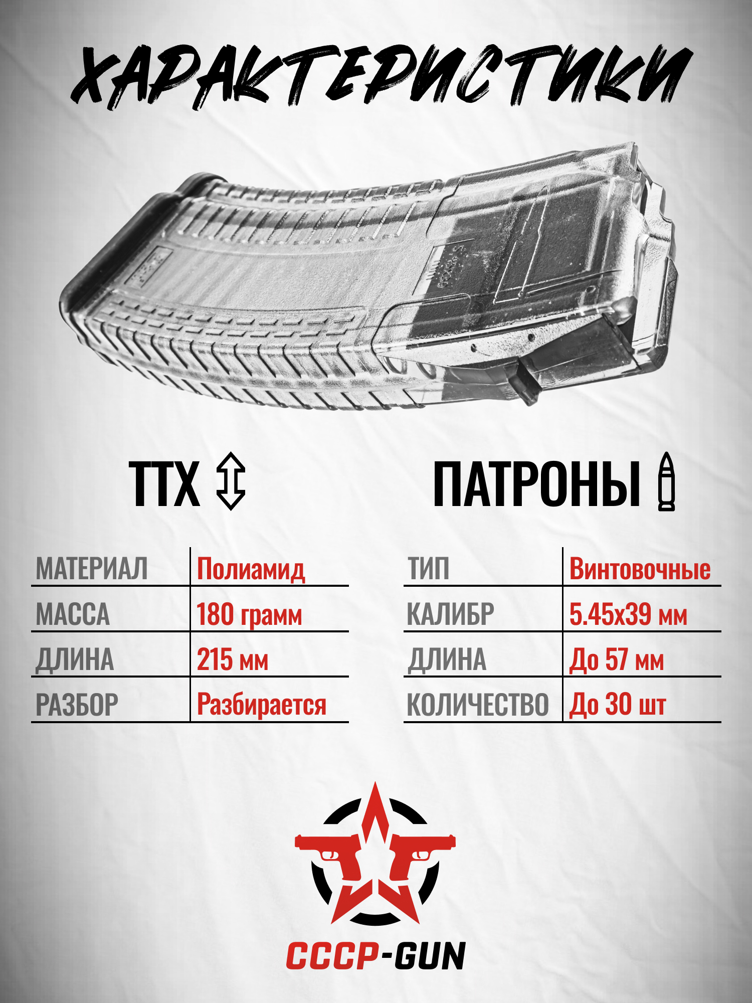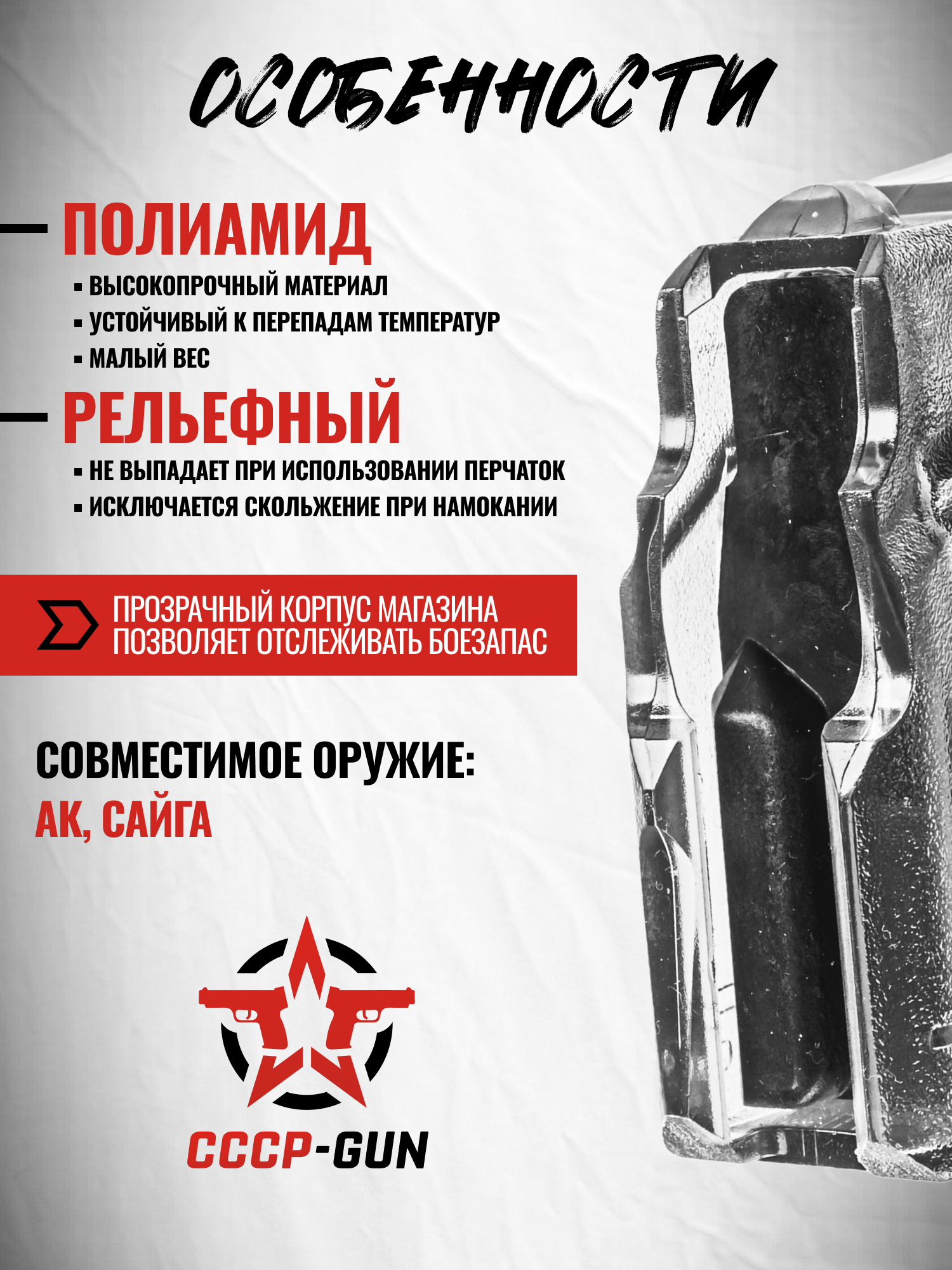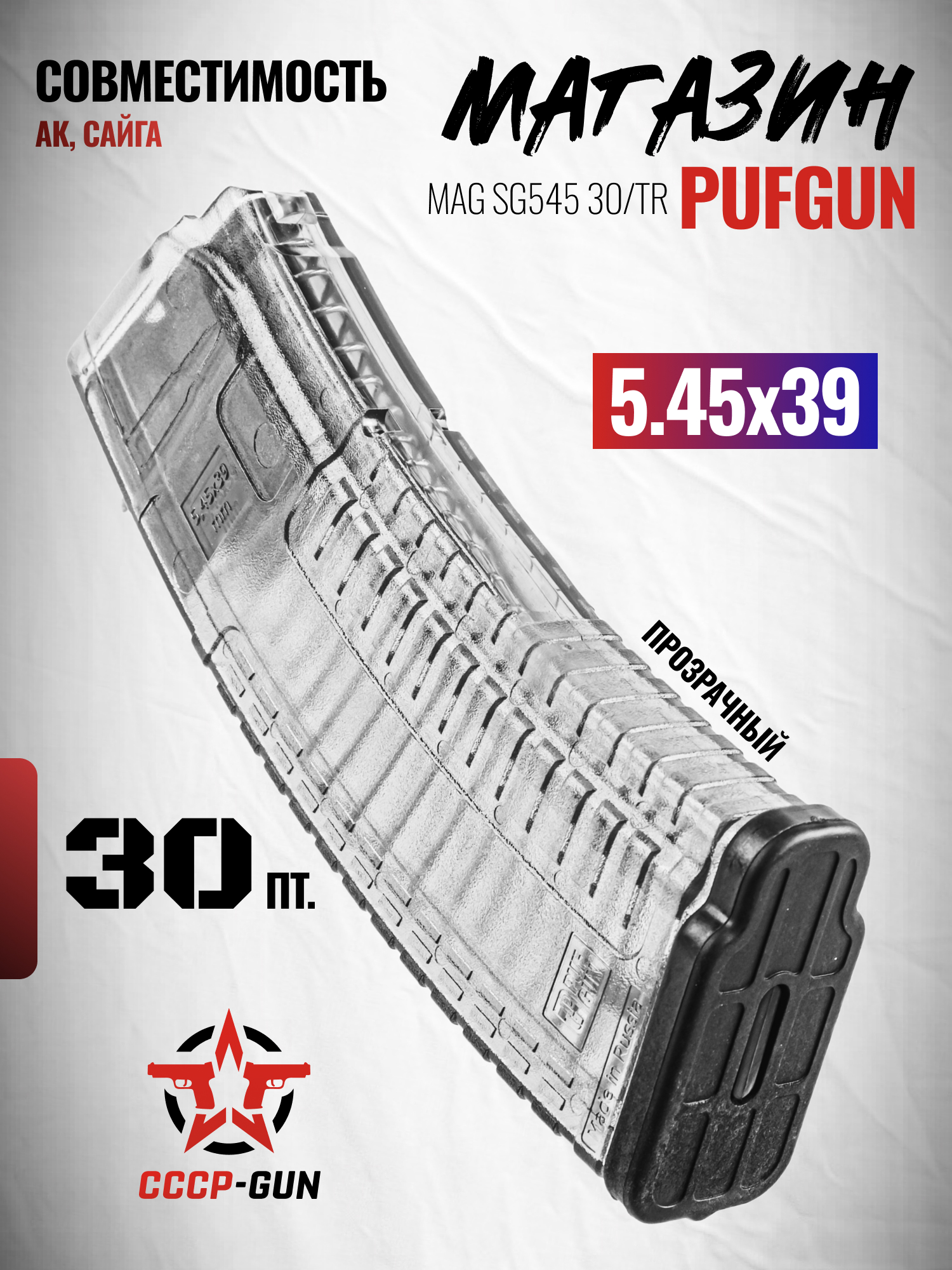 Рассматриваемый магазин от этой фирмы изготовлен для эксплуатации с автоматами Калашникова 1974 года и со схожими по типу шахты, а также с их гражданскими модификациями, такими как Сайга - накопитель совместим с калибром 5.45х39 мм. Отличительная черта этой модели заключается в визуальном оформлении - в сравнении с другими продуктами в линейке был применен полиамид, который позволил добиться прозрачных стенок. Благодаря такому решению возможно контролировать остаток количества боеприпасов.