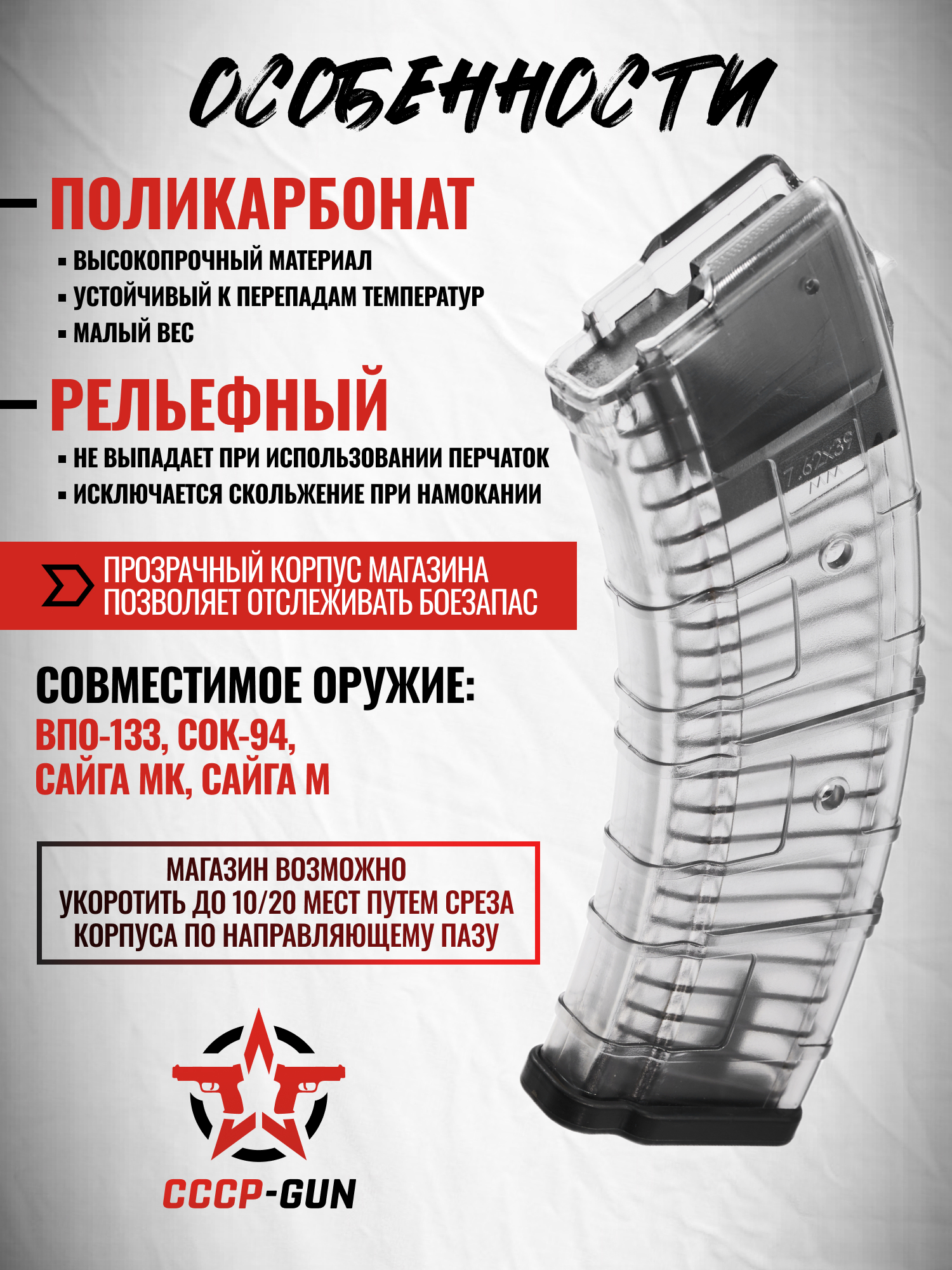 Описание магазина PufGun Mag Sg762 40-30/Tr (30 патронов, Вепрь-К, Сайга МК и М, прозрачный)