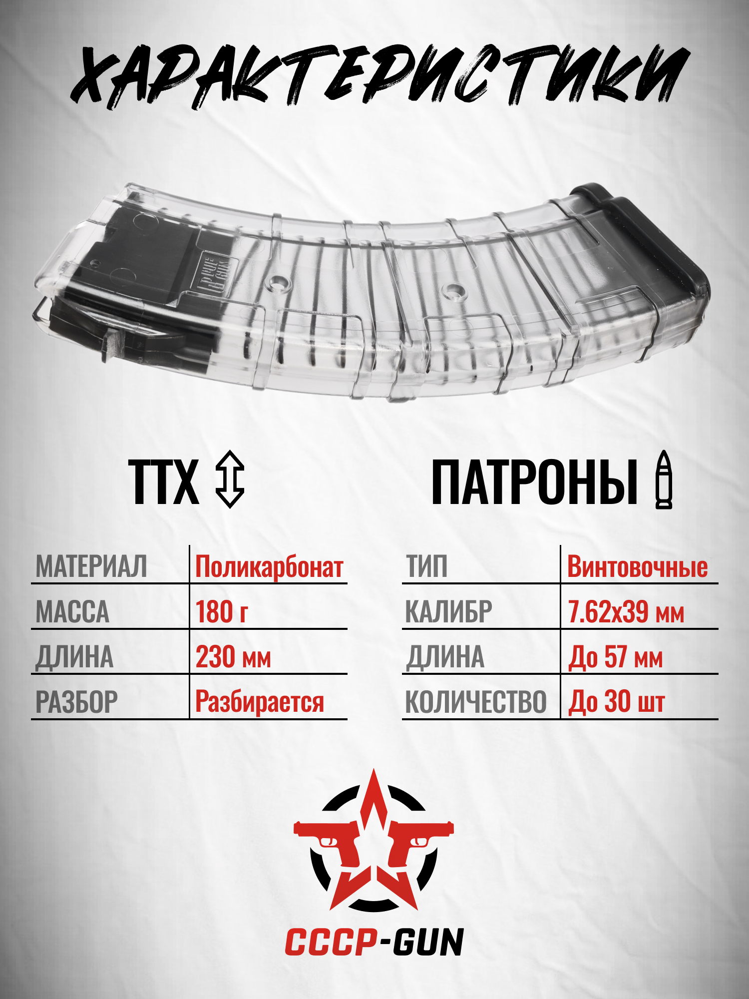 Магазин совместим с патронами 7.62х39 мм. Он вмещает 30 боеприпасов длиной до 57 мм. Спецификой этой модели выступает возможность изменения ее габаритов путем доработки корпуса: владелец может срезать нижнюю часть элемента боепитания и зафиксировать тыльную крышку на направляющих, получив компактный вариант на 10 или 20 мест.
