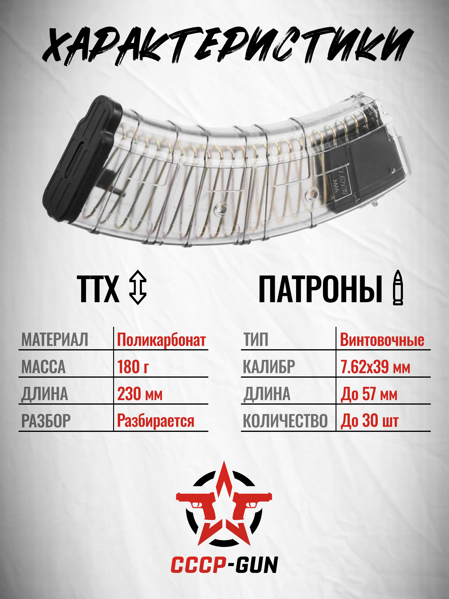 Описание магазина PufGun Mag SGA762 40-30/Tr (30 патронов, 7.62х39, АК, с сухарем, прозрачный)