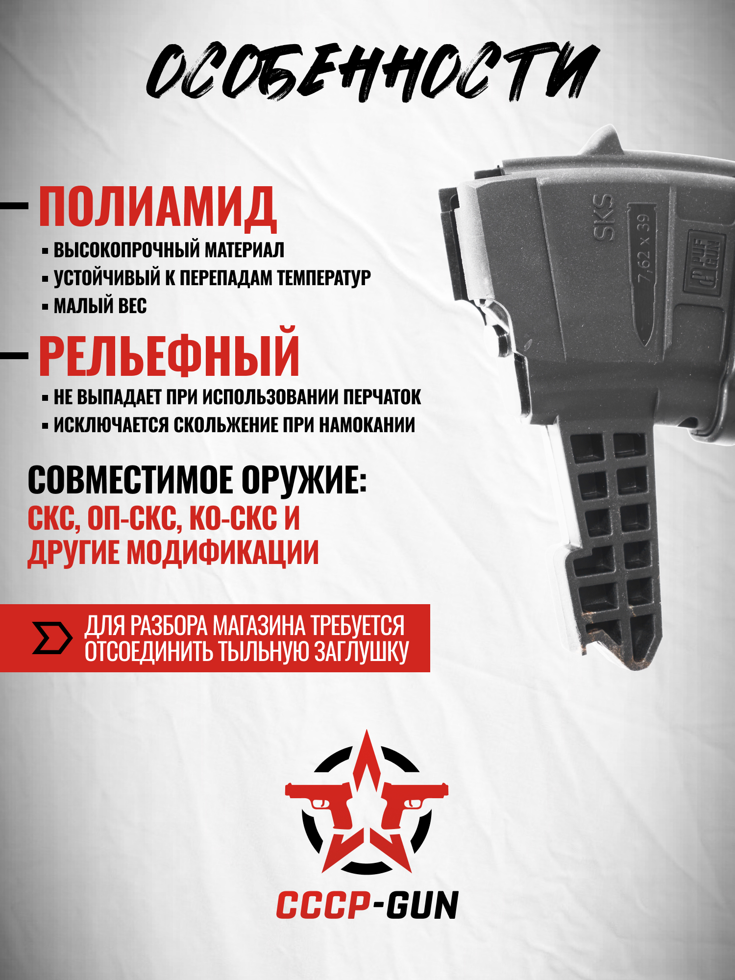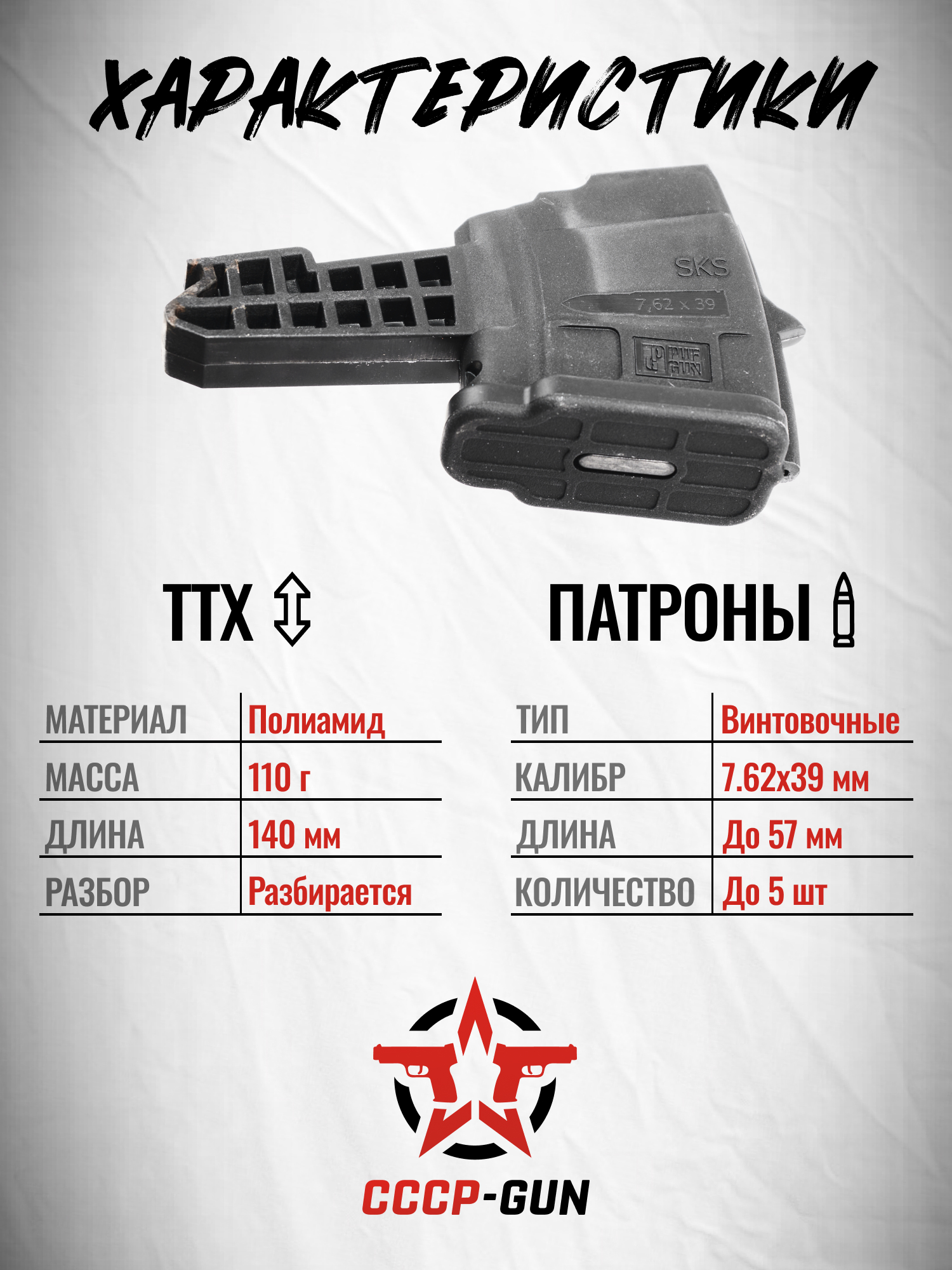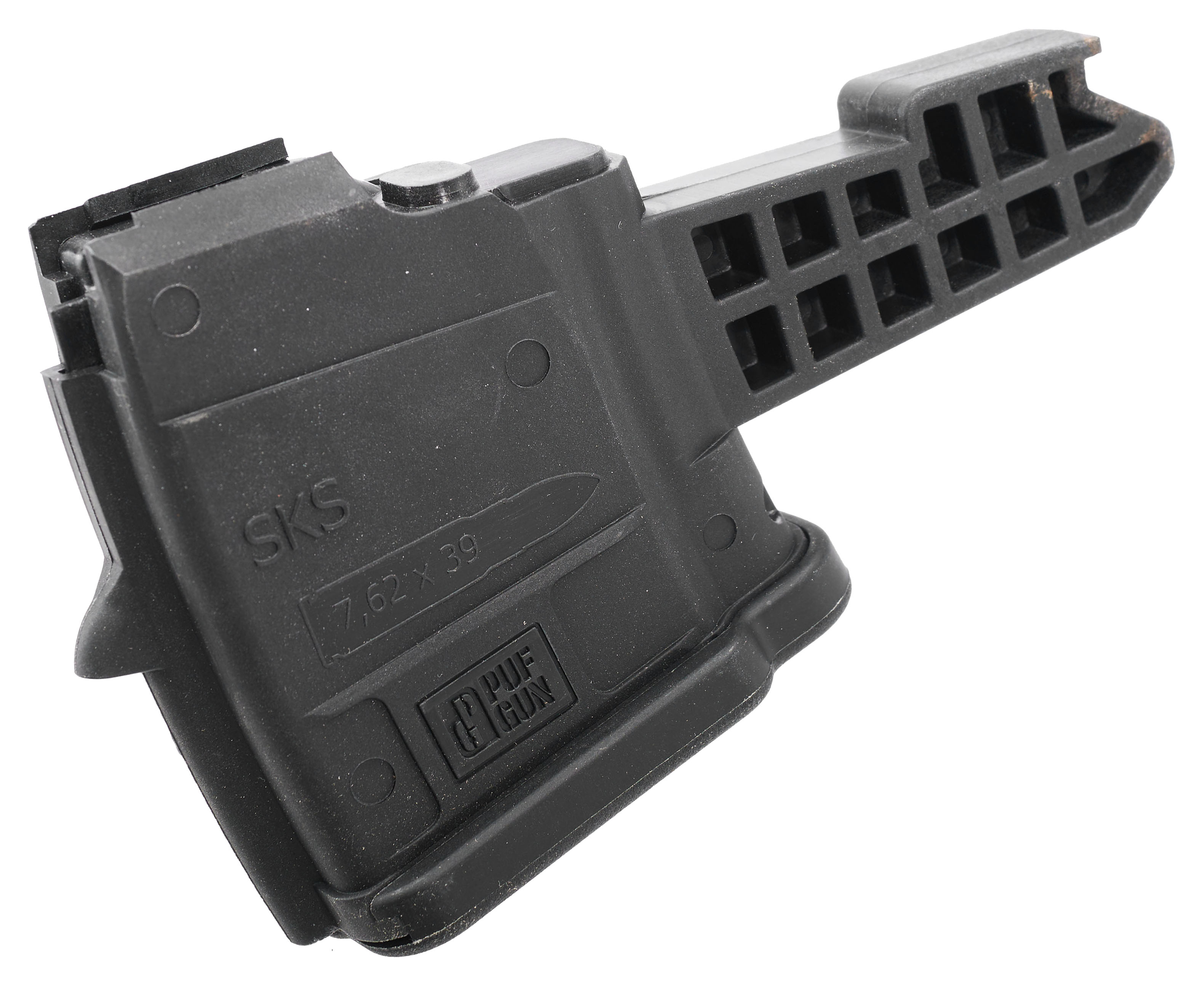 Обозреваемый магазин ПафГан разработан специально для карабинов линейки СКС и их модификаций. Он рассчитан на применение патронов калибра 7.62х39 мм и дарит владельцу возможность использования съемного элемента боепитания.
