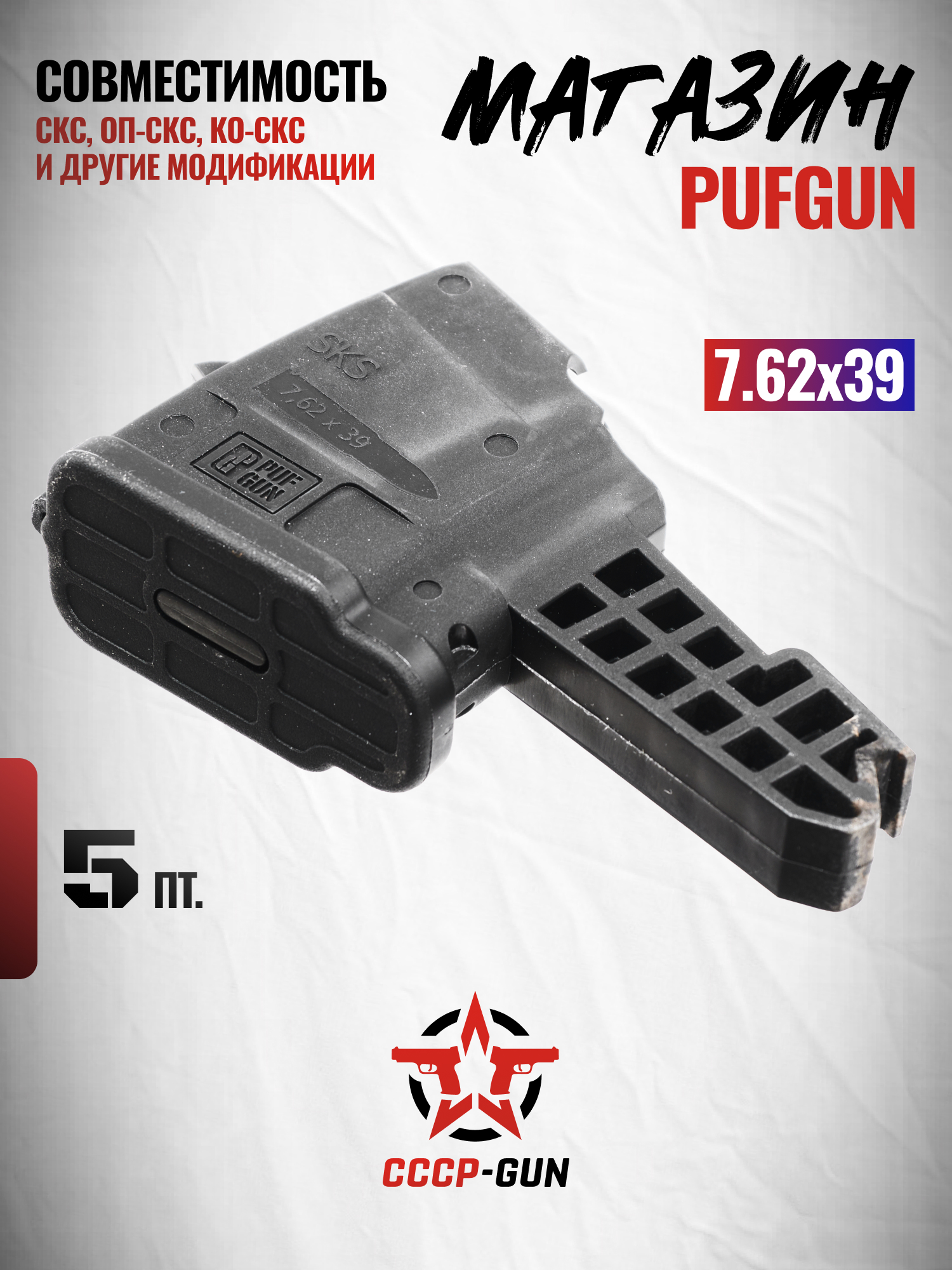 Экземпляр PufGun выполнен из крепкого пластика черного цвета с рельефной поверхностью, которая дает плотный хват и снижает вероятность выскальзывания модели при замене. Весит магазин СКС 5-ти местный 0.11 кг, сам по себе он не утяжелит экипировку стрелка. Важно отметить, что геометрия и вместимость изделия помогают владельцу комфортно вести стрельбу из положения лежа.