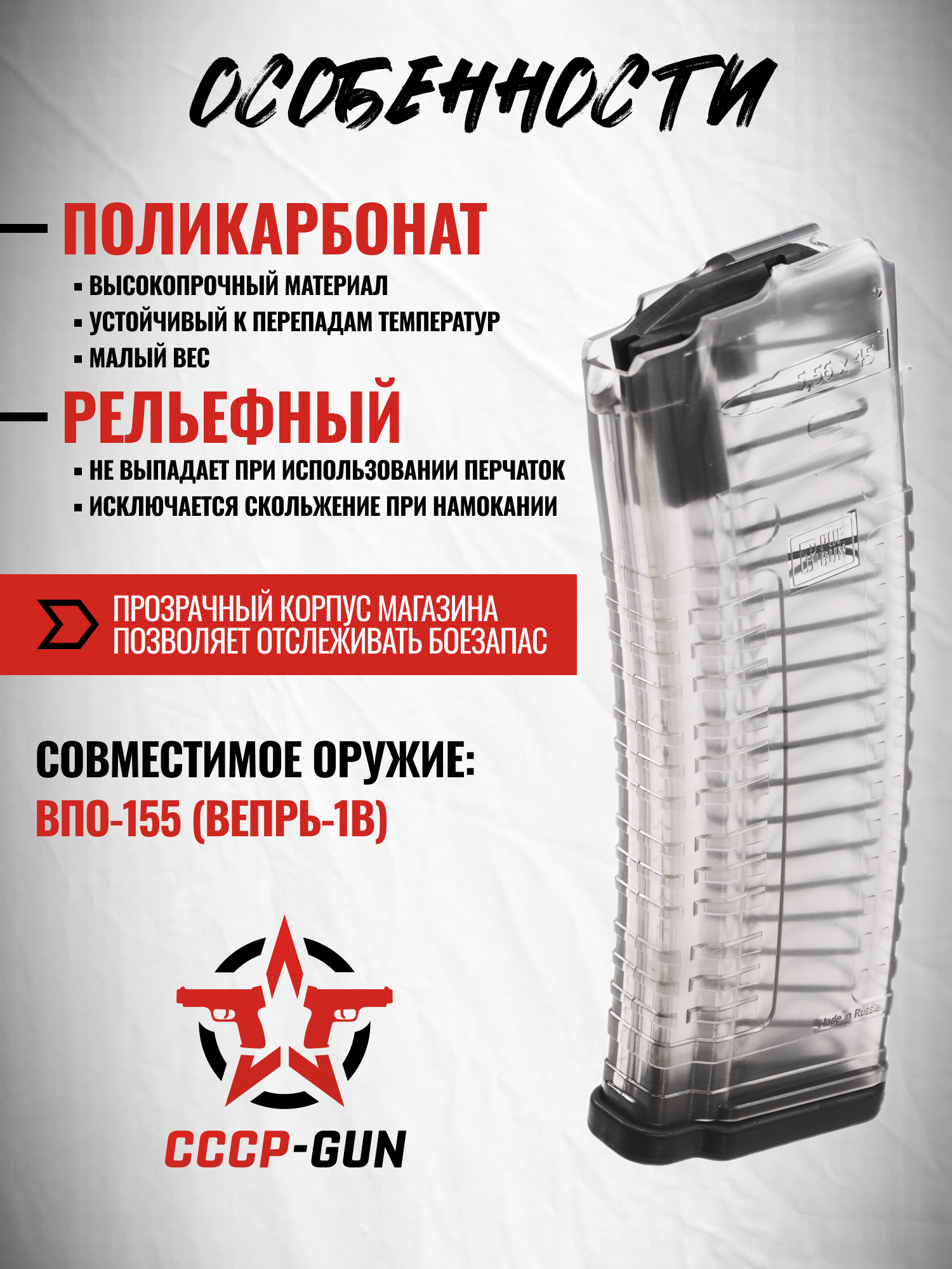 Вепрь 1В магазин вмещает 30 патронов, не превышающих 58 мм в длину. Он поможет владельцу реже отвлекаться на перезарядки. Конструкция выполнена из крепкого полимера, снижающего вес до 0.16 кг, но сохраняющего жесткость. Корпус прозрачен и дает возможность мгновенно оценить текущий боезапас.