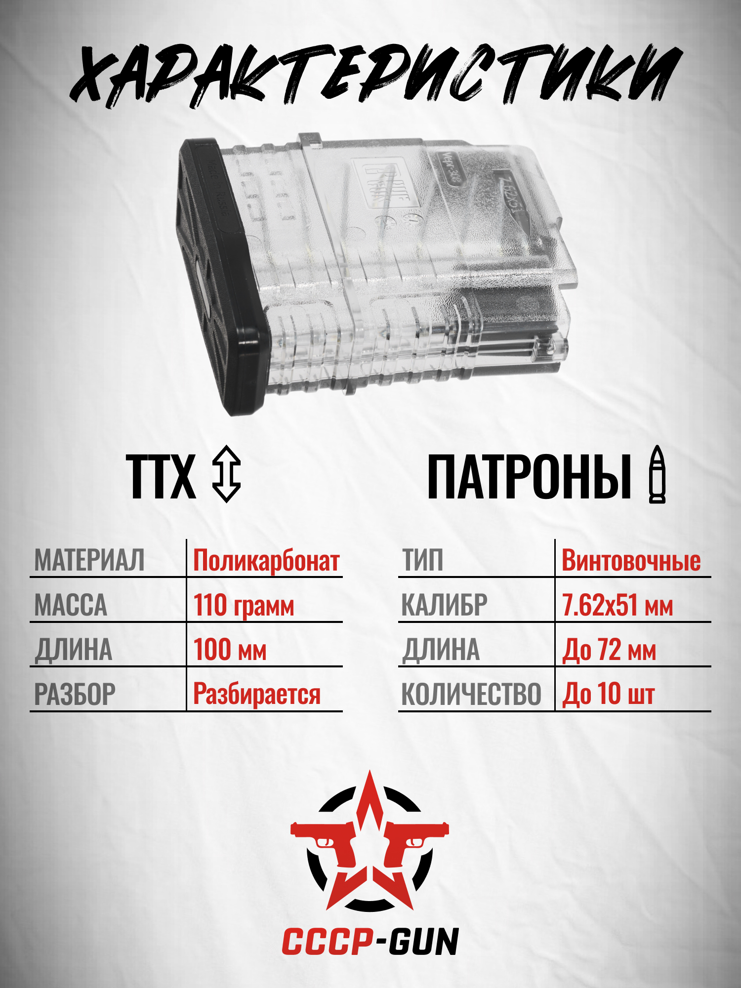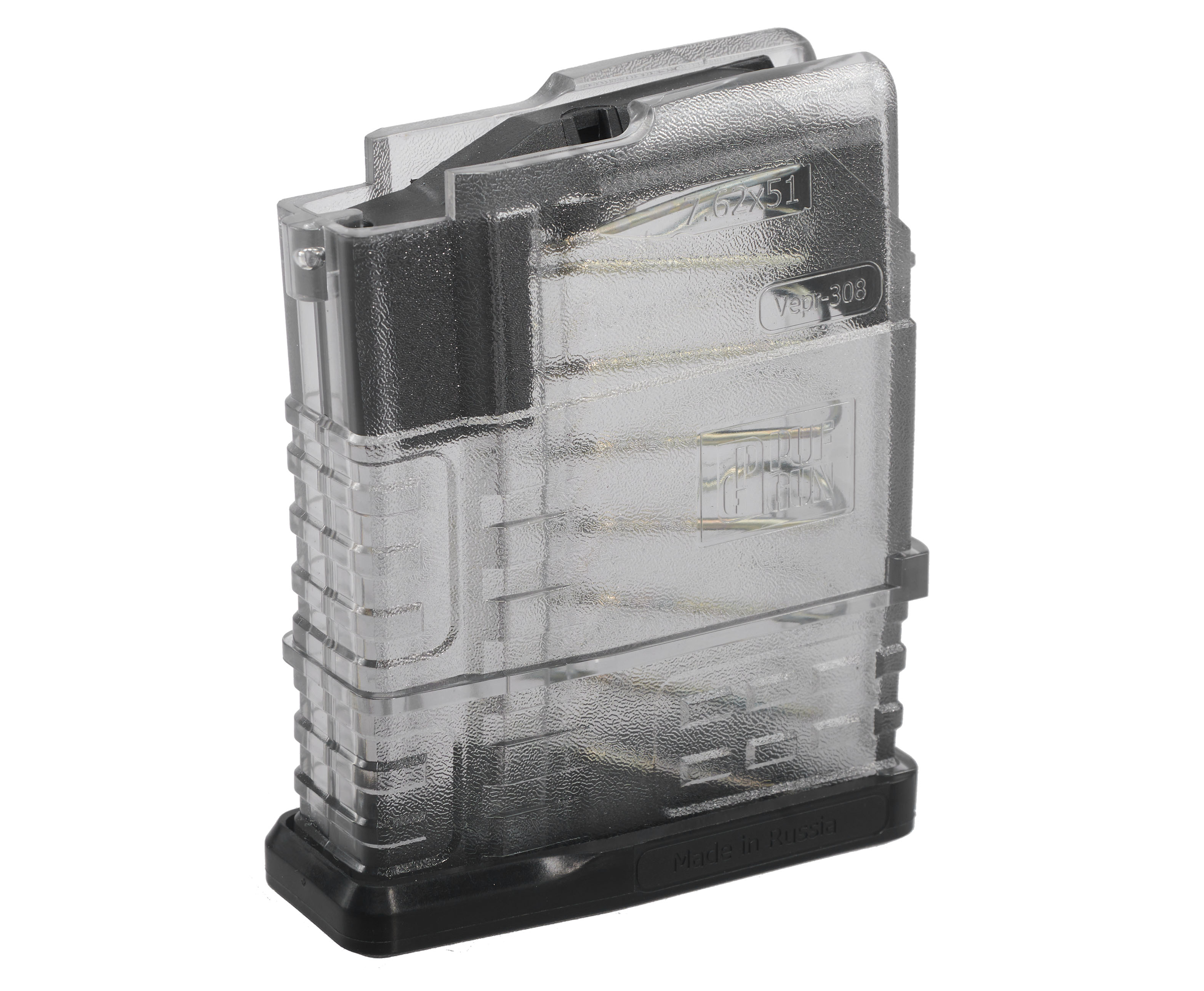 Магазины ПафГан выполнены из крепкого полимера, невосприимчивого к внешним воздействиям, и наделены рельефной поверхностью для уверенного хвата. Прозрачный пластик помогает визуально контролировать боезапас и вовремя перезаряжаться. Масса конструкции в 0.11 кг сделает транспортировку изделия комфортной и не будет перегружать карабин.