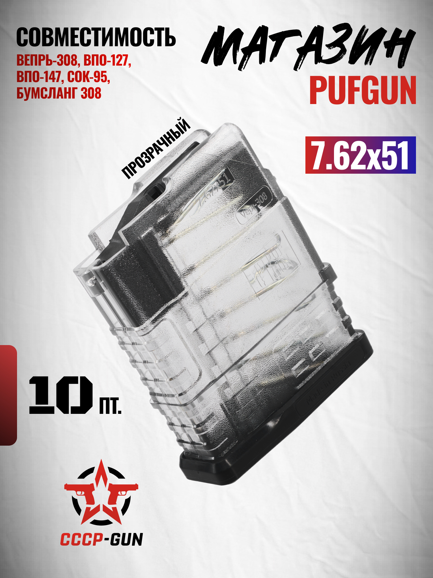 Рассматриваемый магазин PufGun Mag Vp308 25-10/Tr предназначен для применения с карабинами на базе АК линеек Вепрь-308, ВПО-127, ВПО-147 и Бумсланг 308. Конструкция вмещает 10 патронов 7.62х51 мм, не превышающих габаритом 72 мм.
