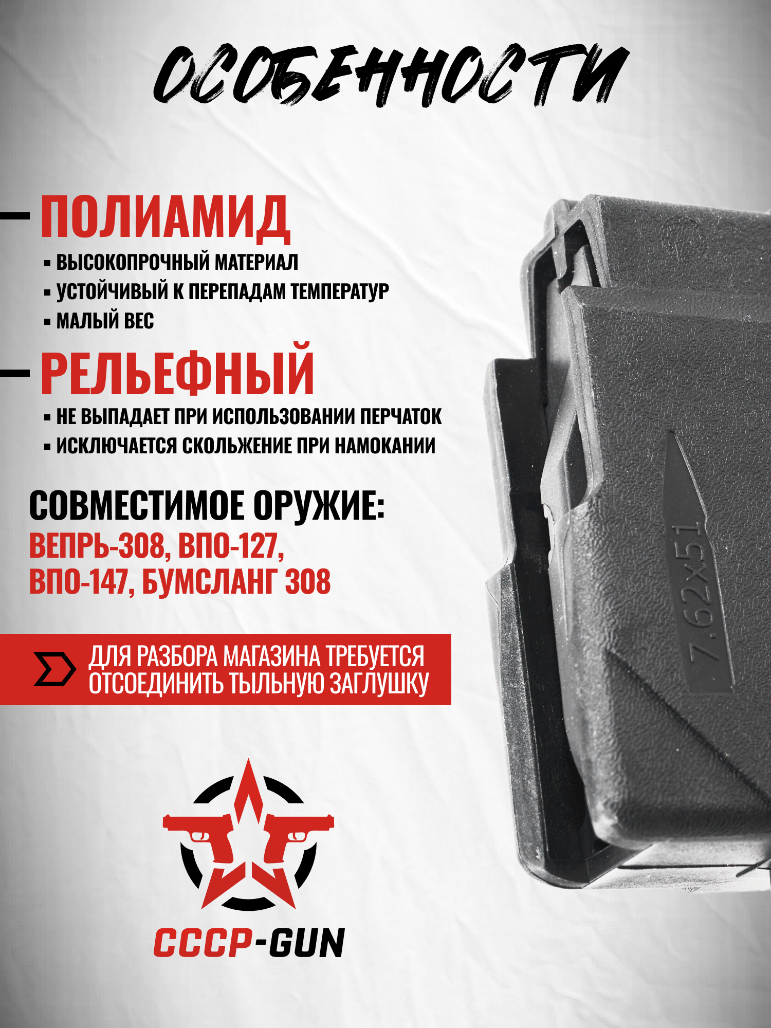 Таким изделием стал рассматриваемый магазин PufGun Mag Vp308 25-5/B. Он разработан специально для линейки карабинов Вепрь-308, а также в полной мере совместим с моделями ВПО-127, ВПО-147 и Бумсланг 308.