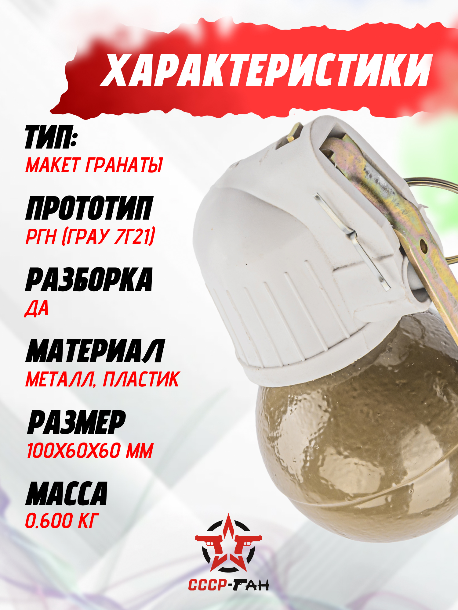 В остальном размеры боевой и представленной модели абсолютно полностью идентичны друг другу. Высота гранаты вместе с детонатором равна 113 мм. Купить макет гранаты РГН можно в учебно-ознакомительных целях. Подобный экземпляр может стать отличным экспонатом для школьного музея, частной коллекции или же поучаствовать в съёмках кино.