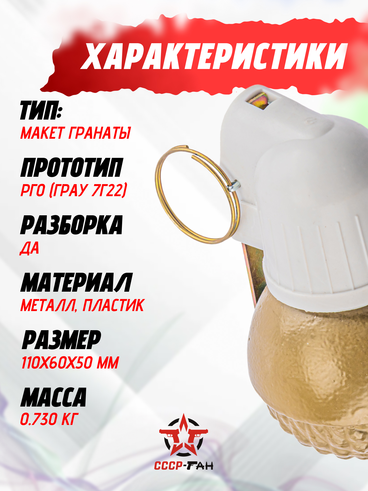 Корпус макета выполнен из цельной части чугуна. Масса макета абсолютно идентично боевому образцу и равна 530 грамм. Стоит отметить, что купить макет гранаты РГО можно и съёмках в кино.
