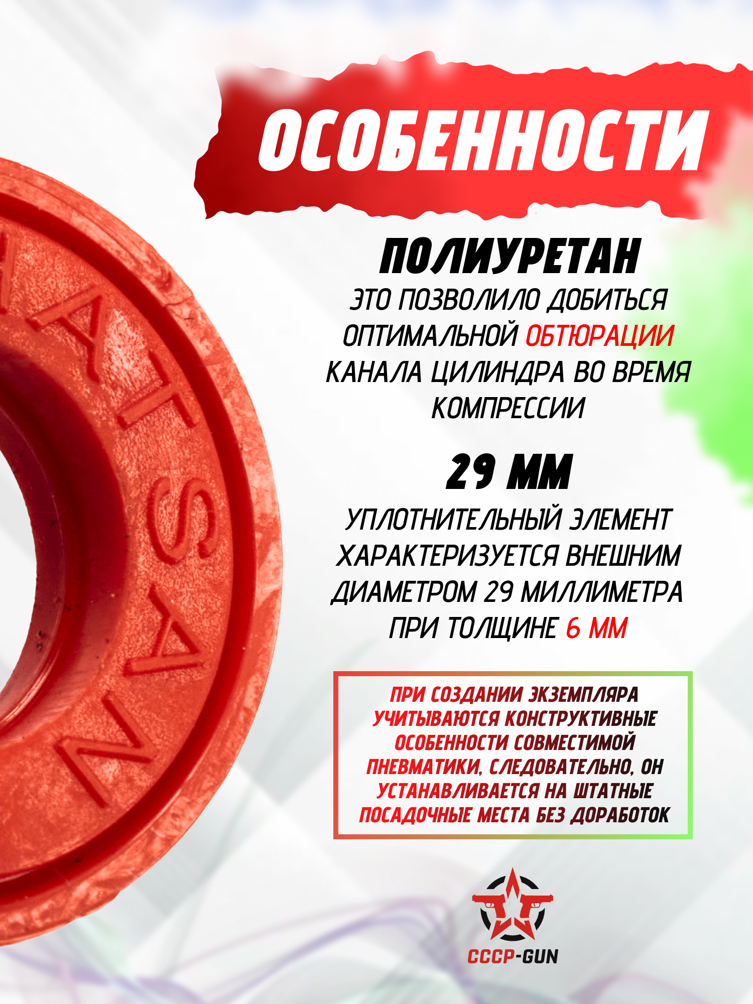 Обозреваемое изделие выполнено толщиной, не превышающей 6 мм. Замена манжеты станет необходимым шагом тогда, когда штатная деталь винтовки износилась и больше не может поддерживать должную герметичность цилиндра. Правильная установка модели Хатсан восстановит показатели дульной энергии винтовки до первоначальных значений.