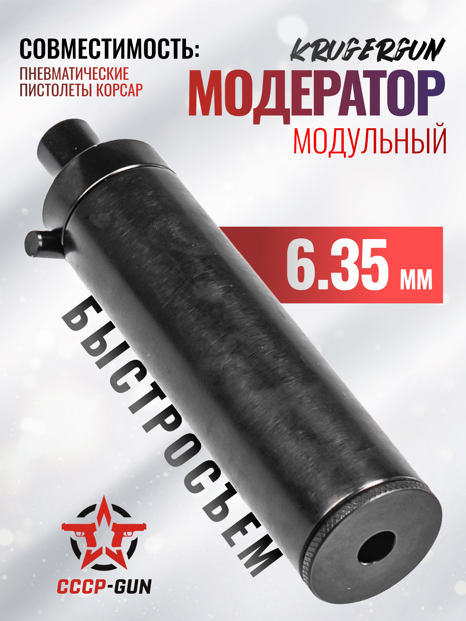 Производитель представил рассматриваемый саундмодератор, который предназначается специально для пистолетов линейки Корсар. Преимуществом конкретного изделия выступает система быстрого демонтажа или установки, реализованная посредством подпружиненного замкового узла и модифицированного натяжителя ствола, включенного в комплектацию. Упомянутый компонент навинчивается на ствольный канал взамен стандартной детали.