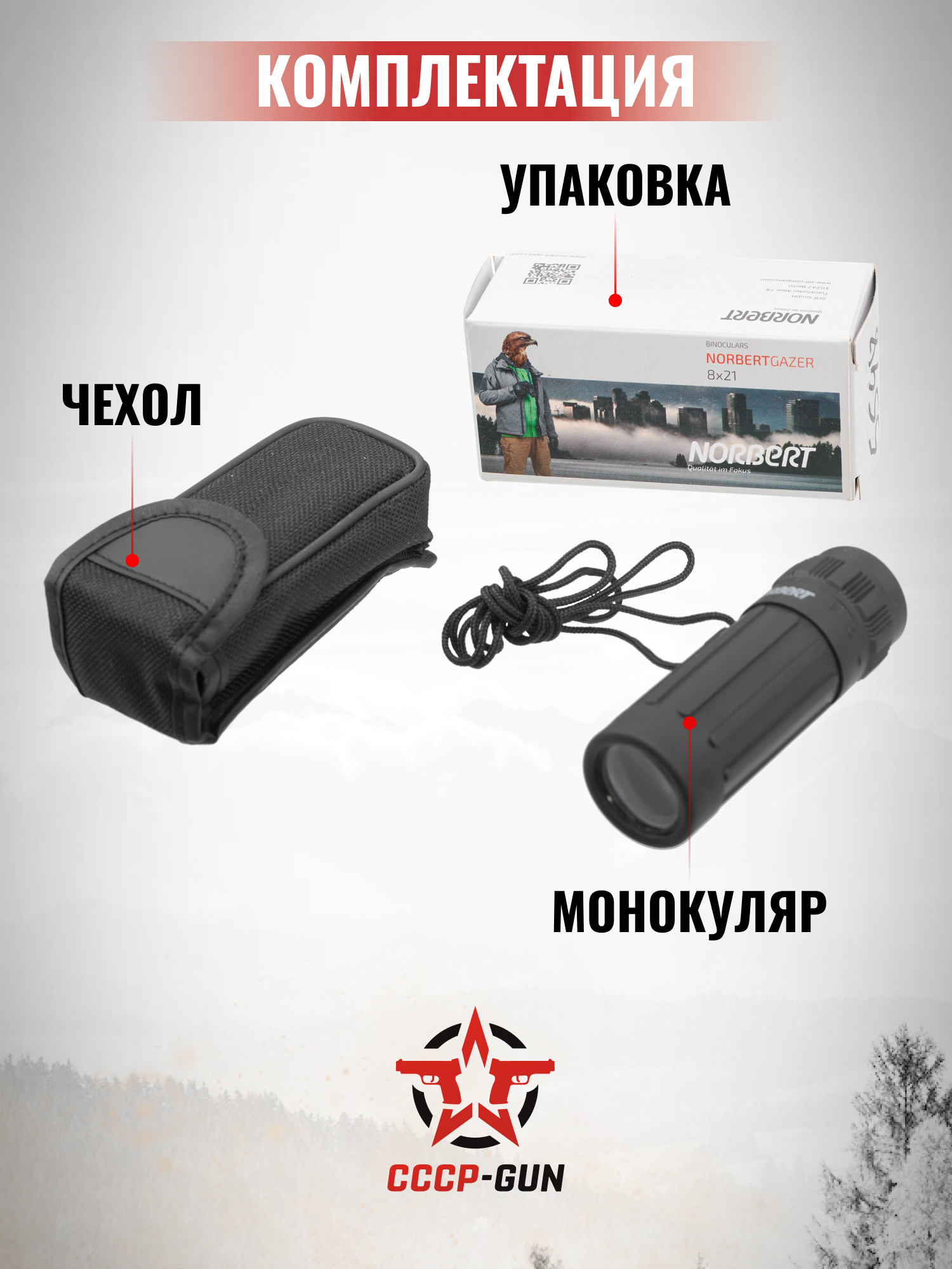 В комплект поставки монокуляра входит инструкция, салфетка из микрофибры и защитный чехол. Окуляр прибора оснащается диоптрийной настройкой, что позволит видеть чёткое изображение даже людям с ослабленным зрением. Корпус монокуляра Norbert Gazer оснащается прорезиненной поверхностью, что улучшает удержание прибора даже во влажных условиях.