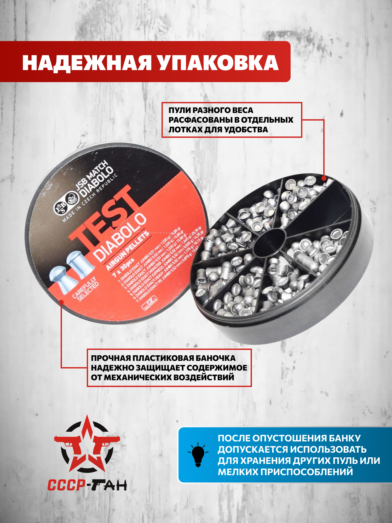 | Комплектующие | Металлическая банка; 30 свинцовых пуль Exact Jambo 5.51 мм; 30 свинцовых пуль Exact Jambo 5.52 мм; 30 свинцовых пуль Exact Jambo 5.53 мм; 30 свинцовых пуль Exact Monster Jambo 5.52 мм; 30 свинцовых пуль Exact Express Jambo 5.52 мм; 30 свинцовых пуль Exact Heavy Jambo 5.52 мм; 30 свинцовых пуль Exact RS Jambo 5.52 мм |