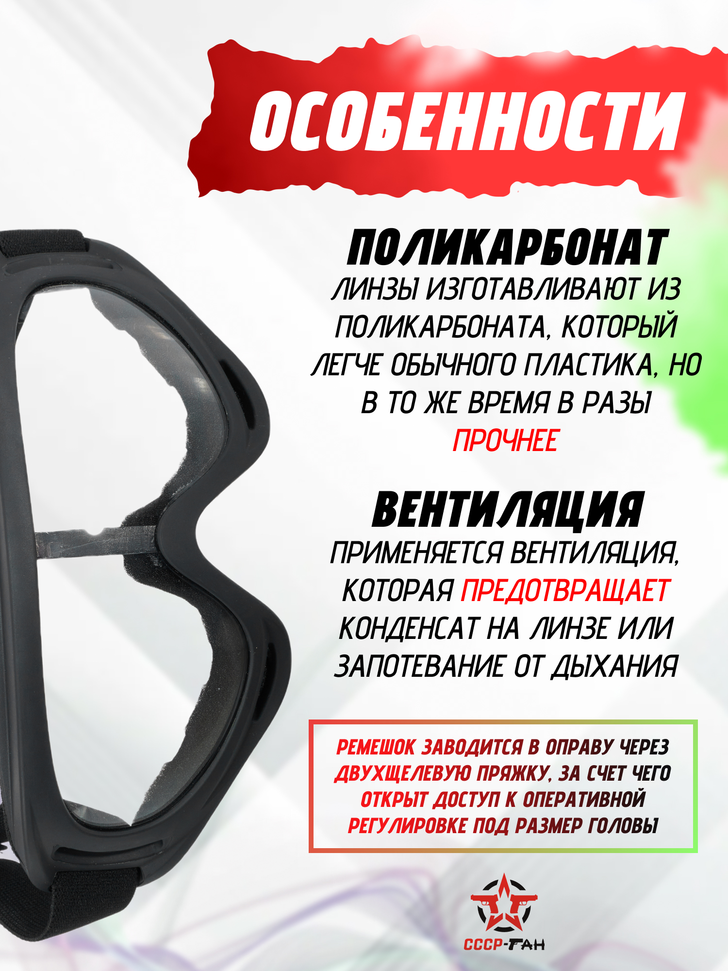 | Предназначение модели | Очки предназначены для защиты глаз стрелка спереди и сбоку от различных частиц |