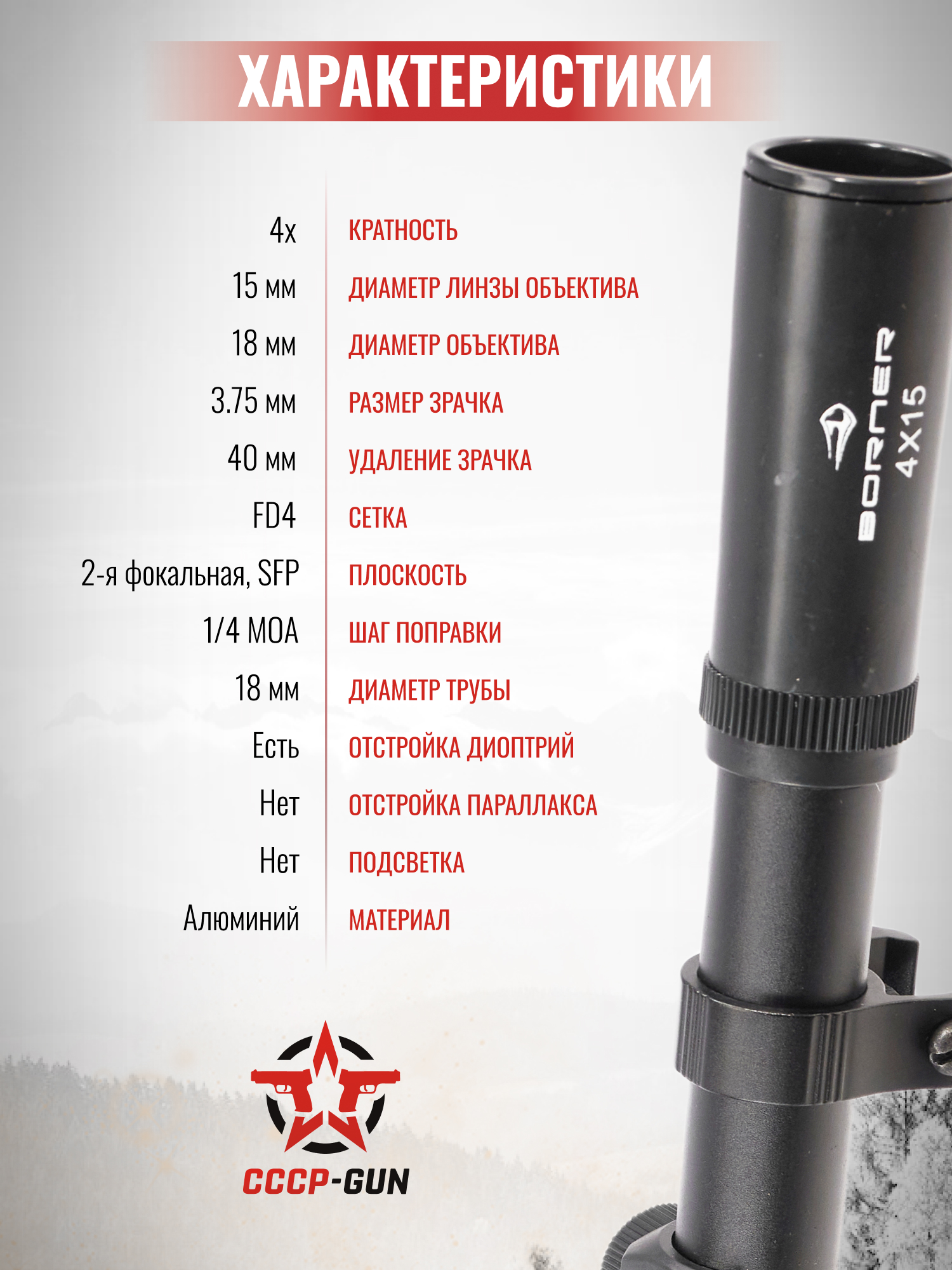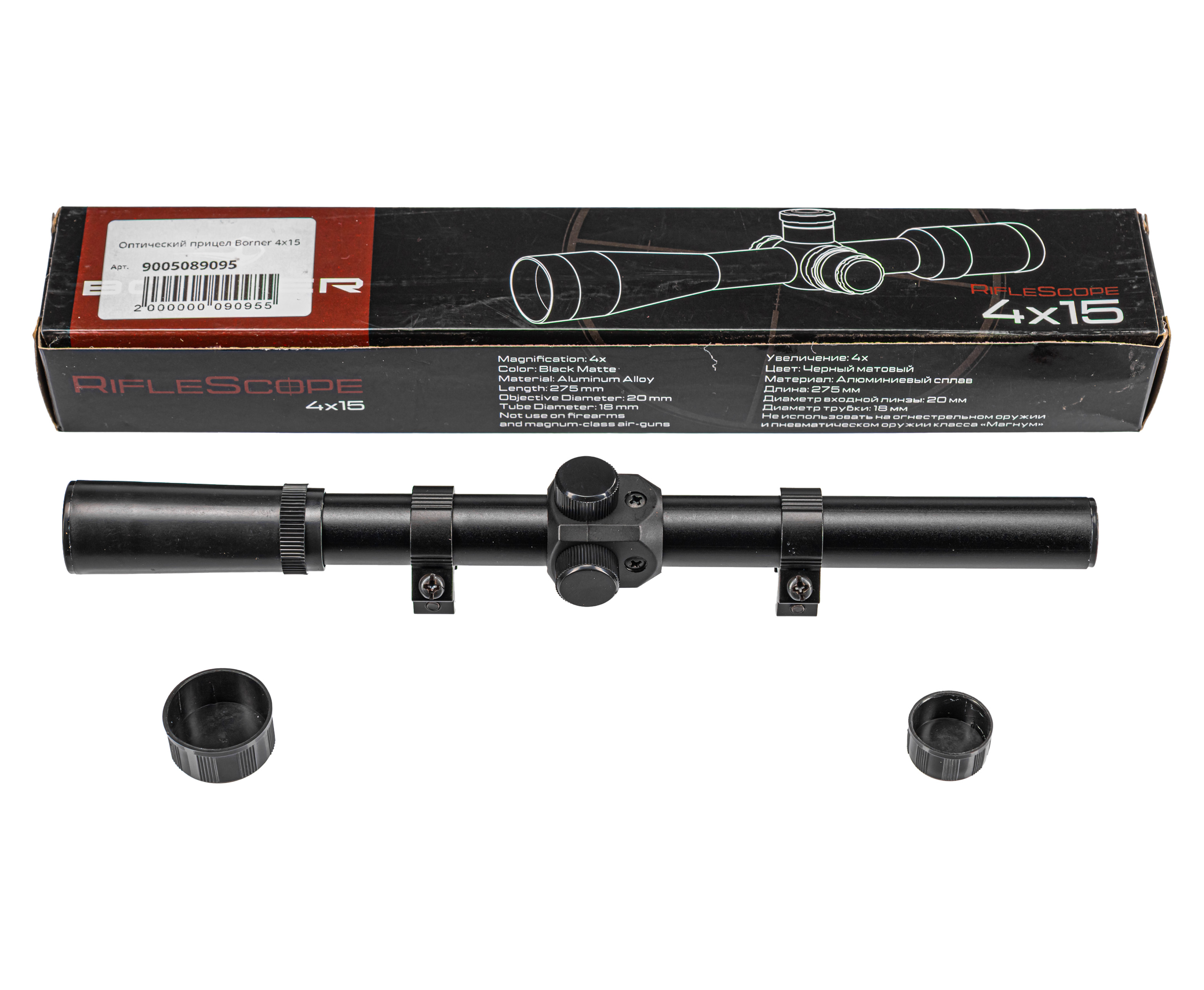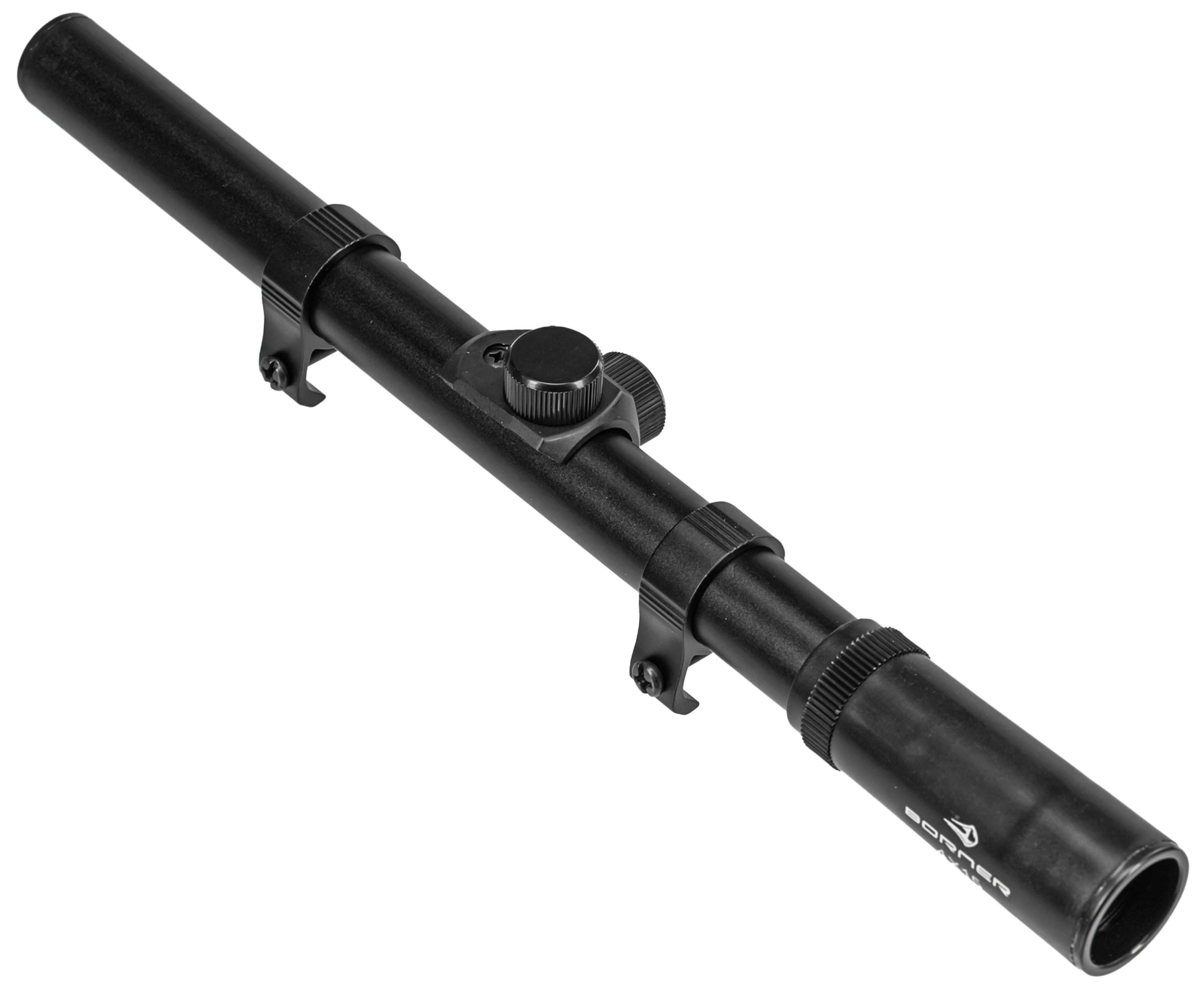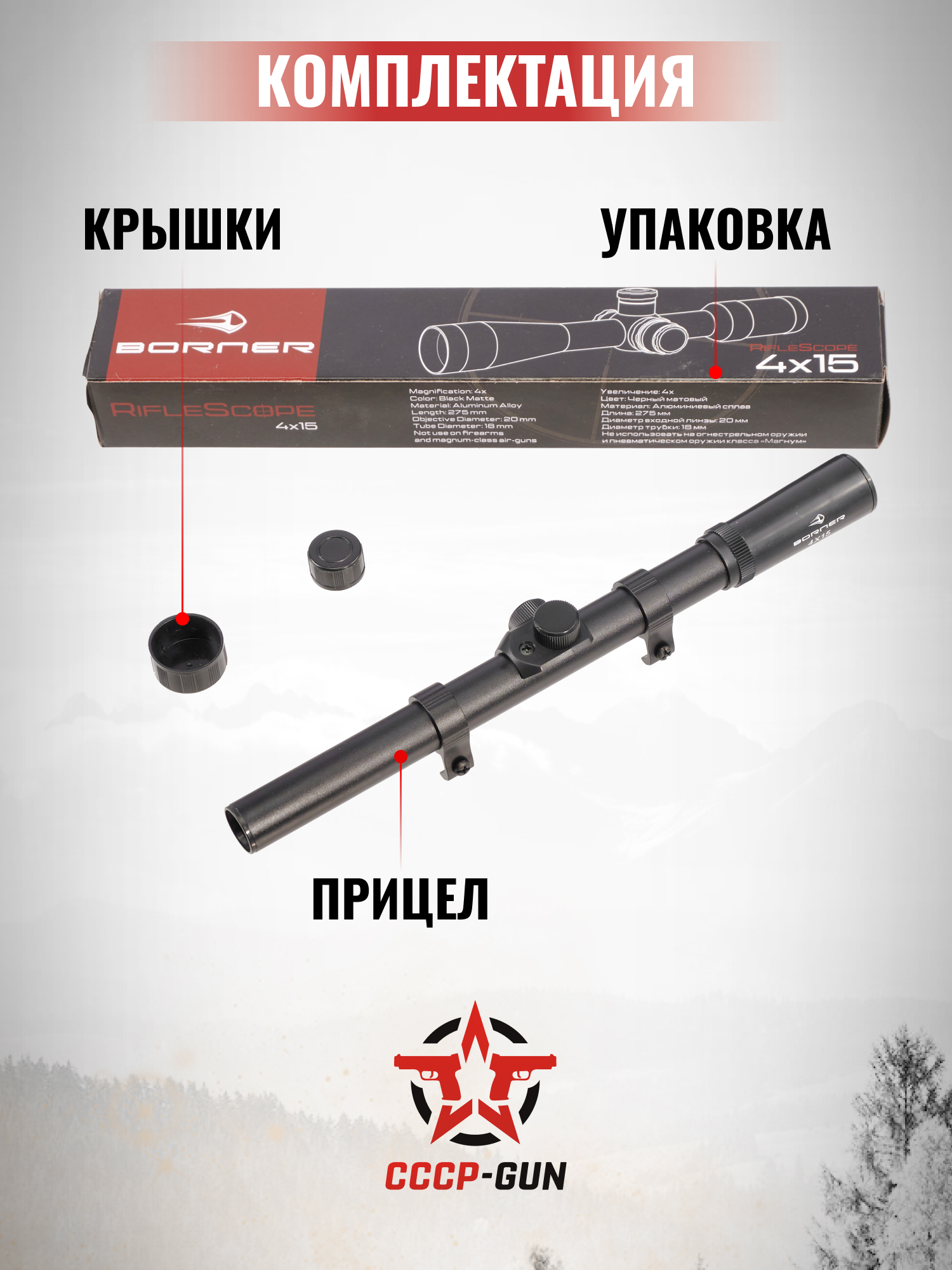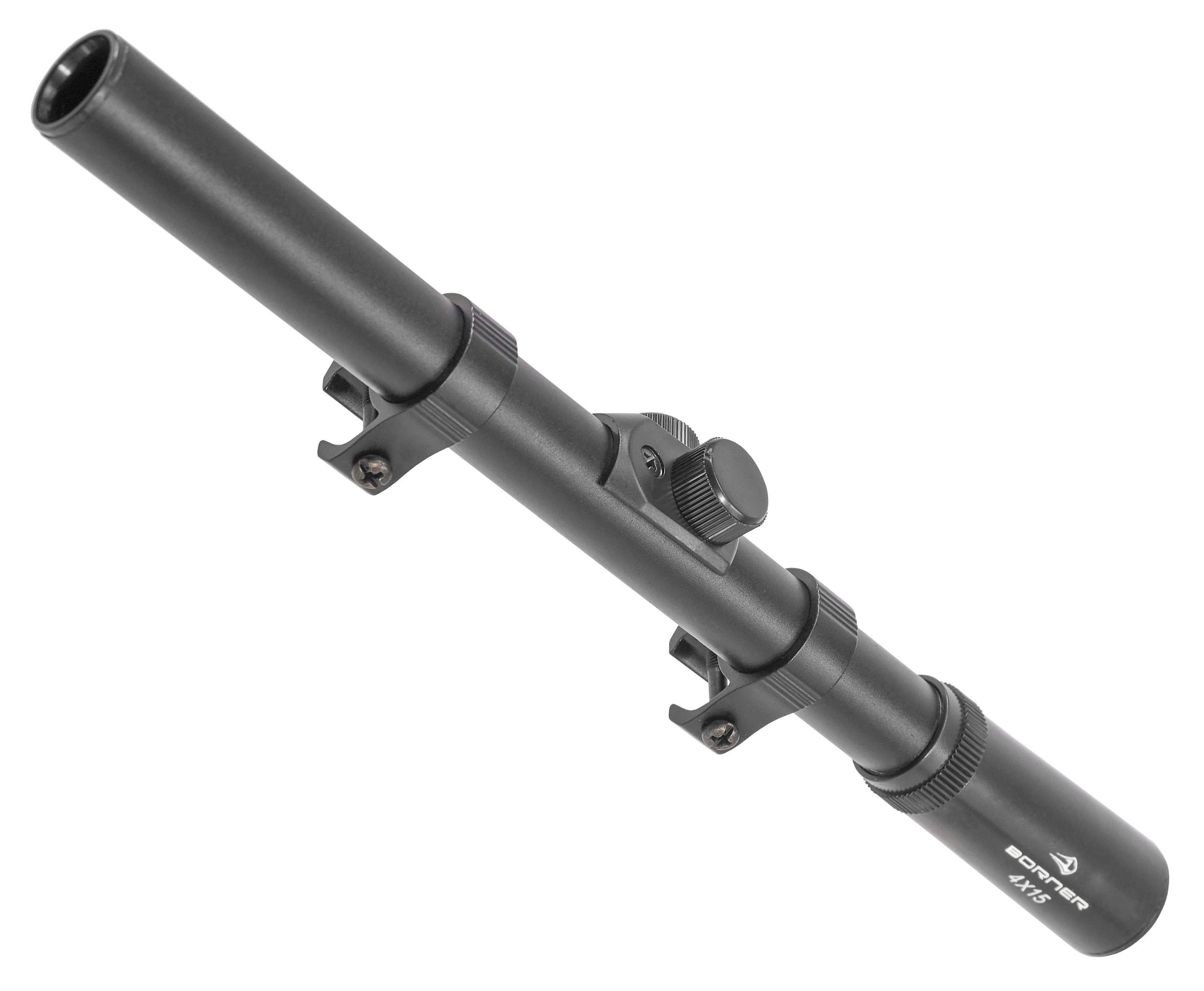 Модель построена на базе 20 мм трубы с 15 мм входной линзой. Это предполагает использование колец соответствующего диаметра, которые есть в комплекте. Подойдут подобные Borner прицелы для пневматики МР 512 и других моделей с планкой или фрезерованными пазами типа «Ласточкин хвост».