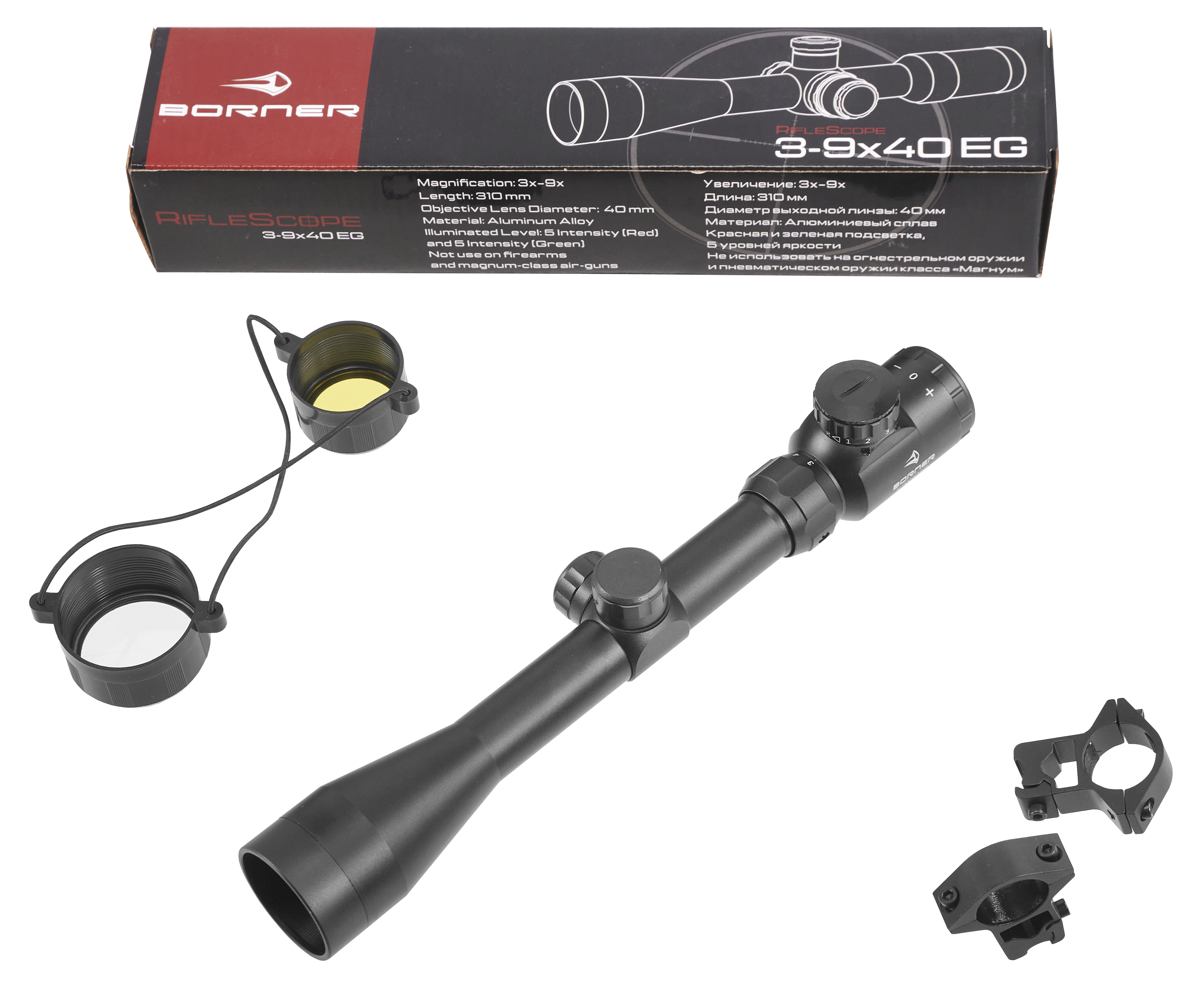 Модель металлическая - обращение к алюминиевому сплаву делает внутренние элементы и корпус оптики Борнер защищенными от влаги, а также повышает ресурс изделия. Но, несмотря на использование указанного материала, образец остался легким - 370 г. Следовательно, размещение прицела на винтовке не даст критичного изменения эргономики.