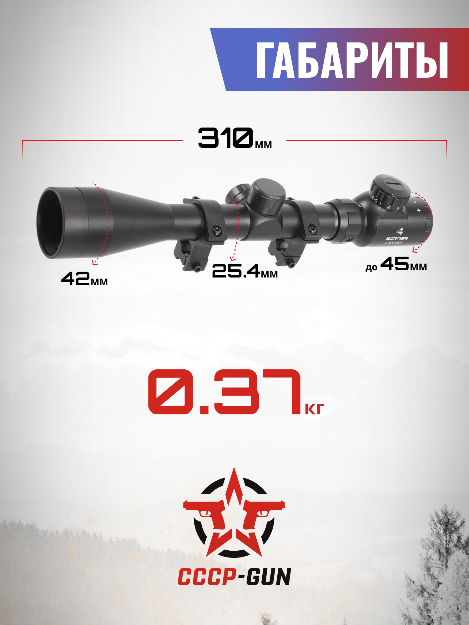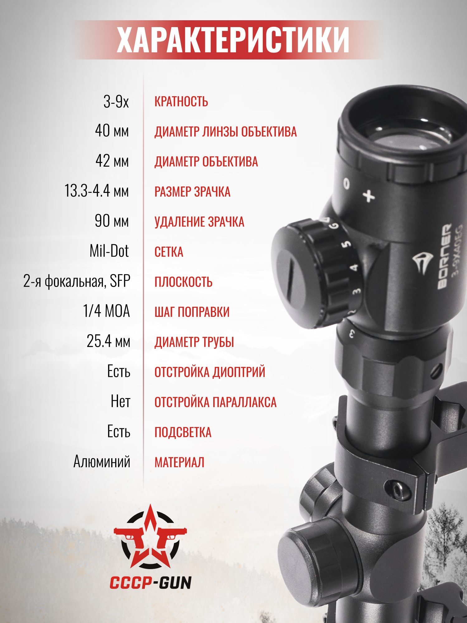 Прицел Borner построили на базе дюймовой трубы - размер 25.4 миллиметра считается наиболее востребованным, соответственно под него изготавливают множество креплений. Свобода выбора позволит совместить обозреваемую оптику с любой винтовкой. В базе же предусмотрели подходящие крепежные кольца, предназначенные для установки оптики на «Ласточкин хвост» 11 мм.