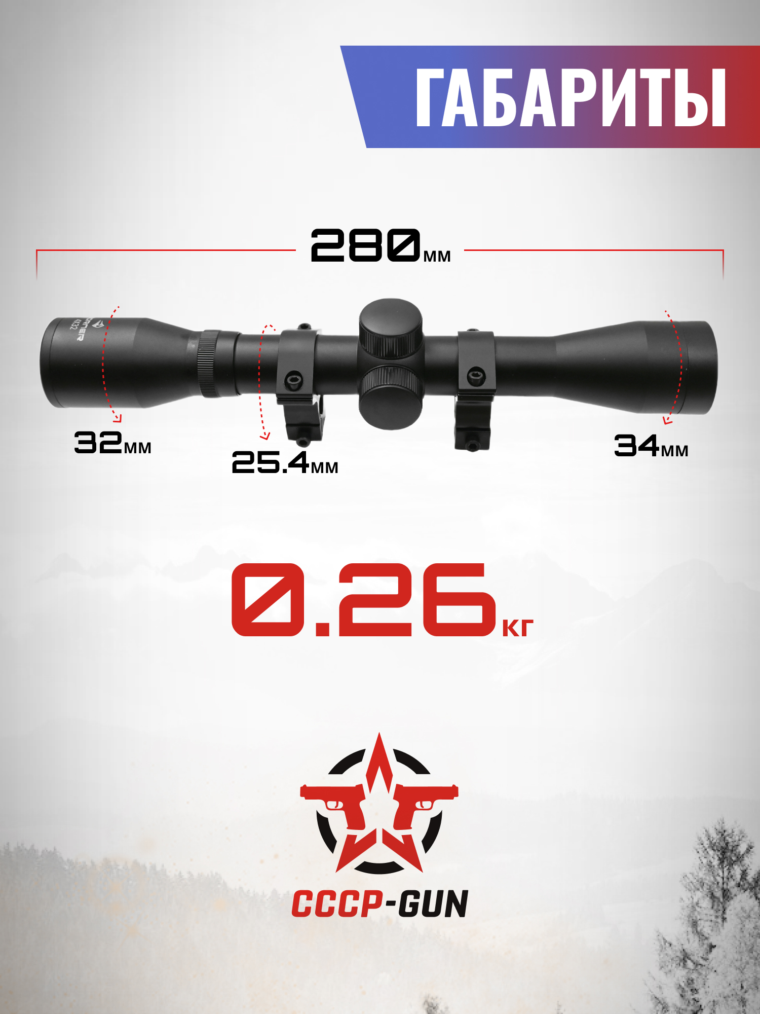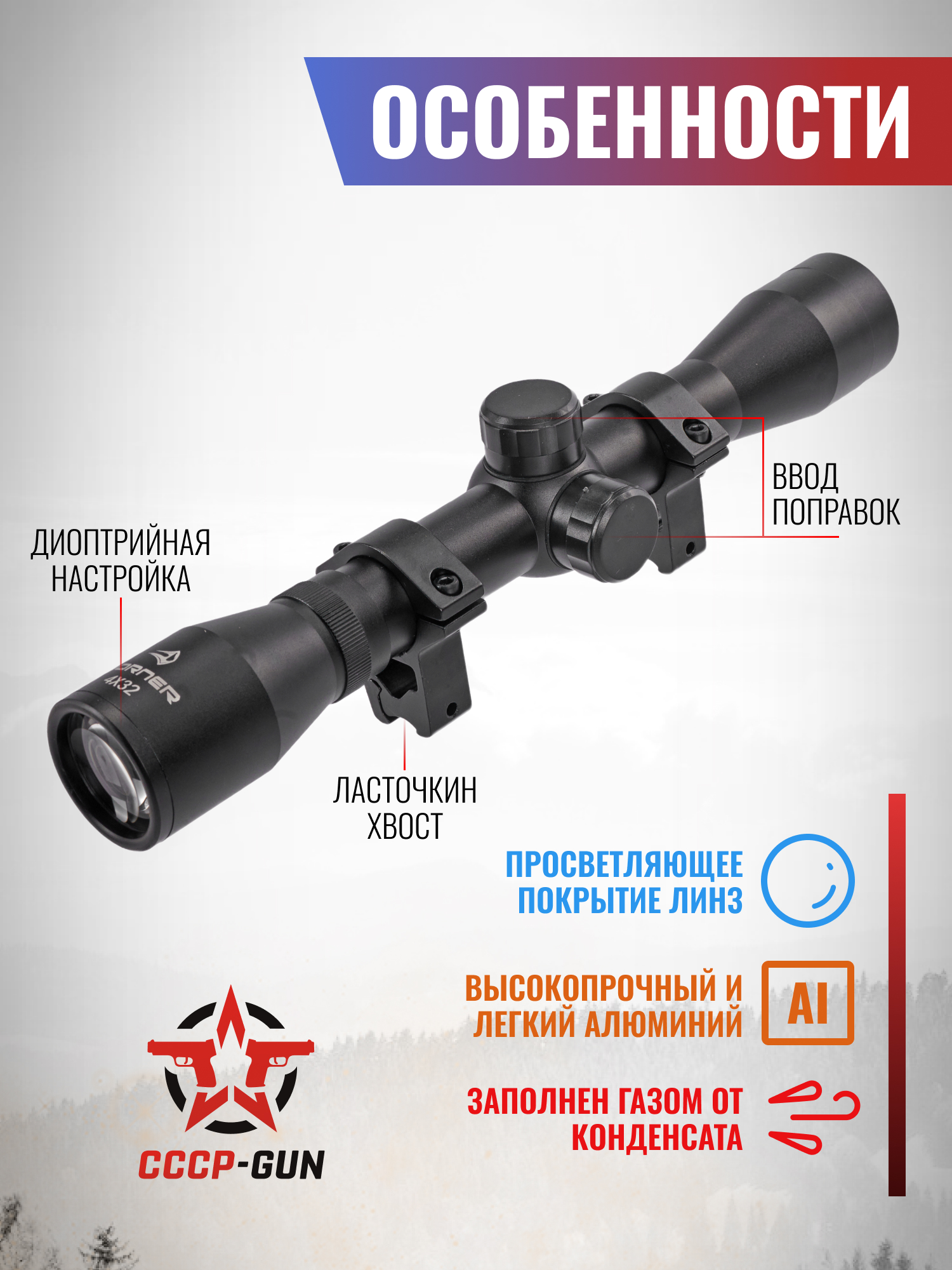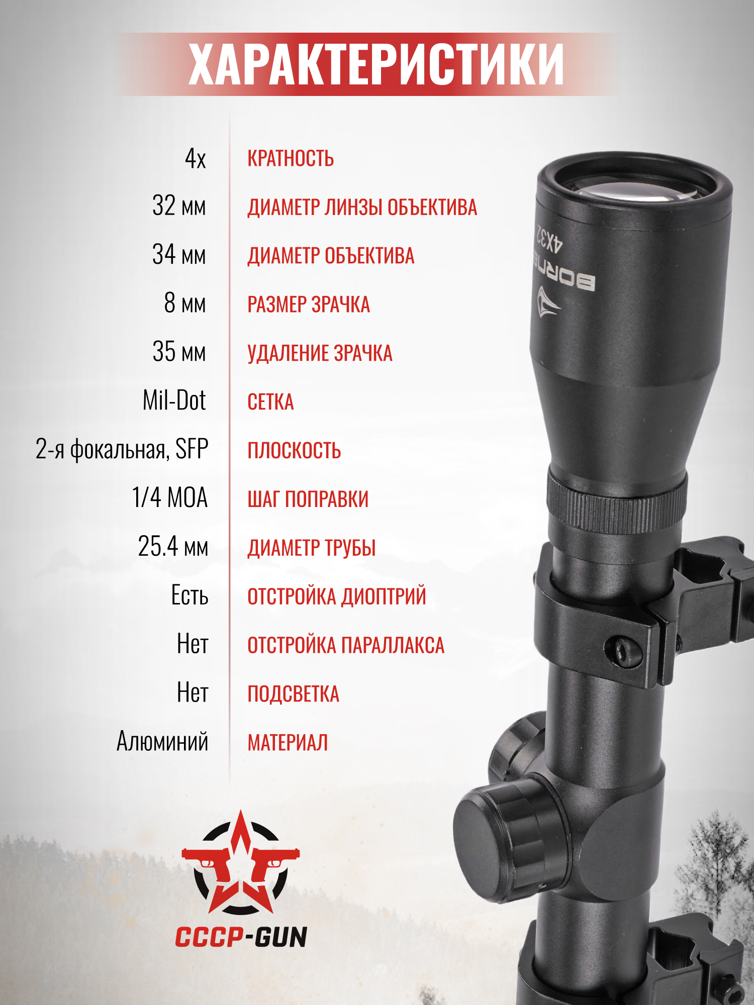 Оптический прицел 4х32 представленной модели предусматривает в наименовании литеру L, что указывает на удлиненную трубу корпуса - в этом случае ее длина составила 295 мм. Соответственно в корпус этой модели заложили более длинные участки для крепления колец, ввиду чего образец становится гибче в плане монтажа на различные платформы. Кроме того, отмечается удаление от тыльной линзы 35 мм, что упрощает прицеливание для начинающего - не потребуется сильно отдалятся от окуляра.