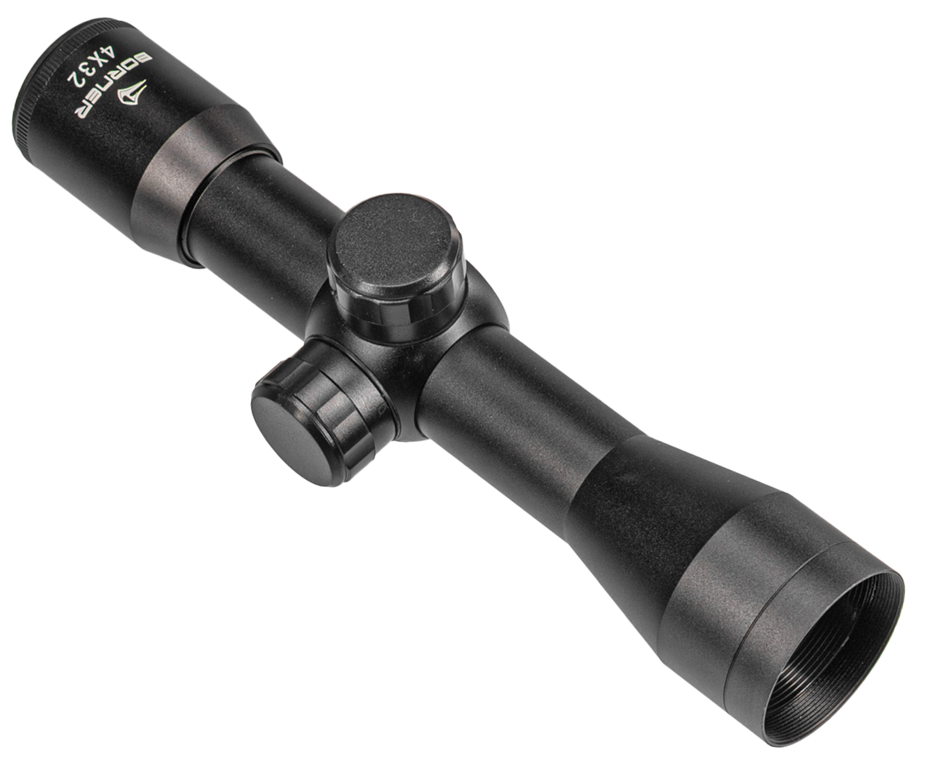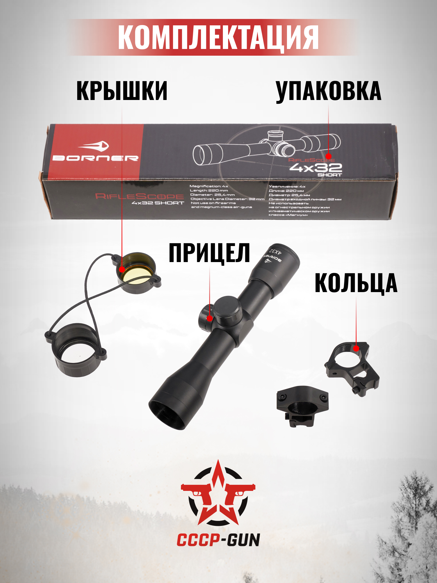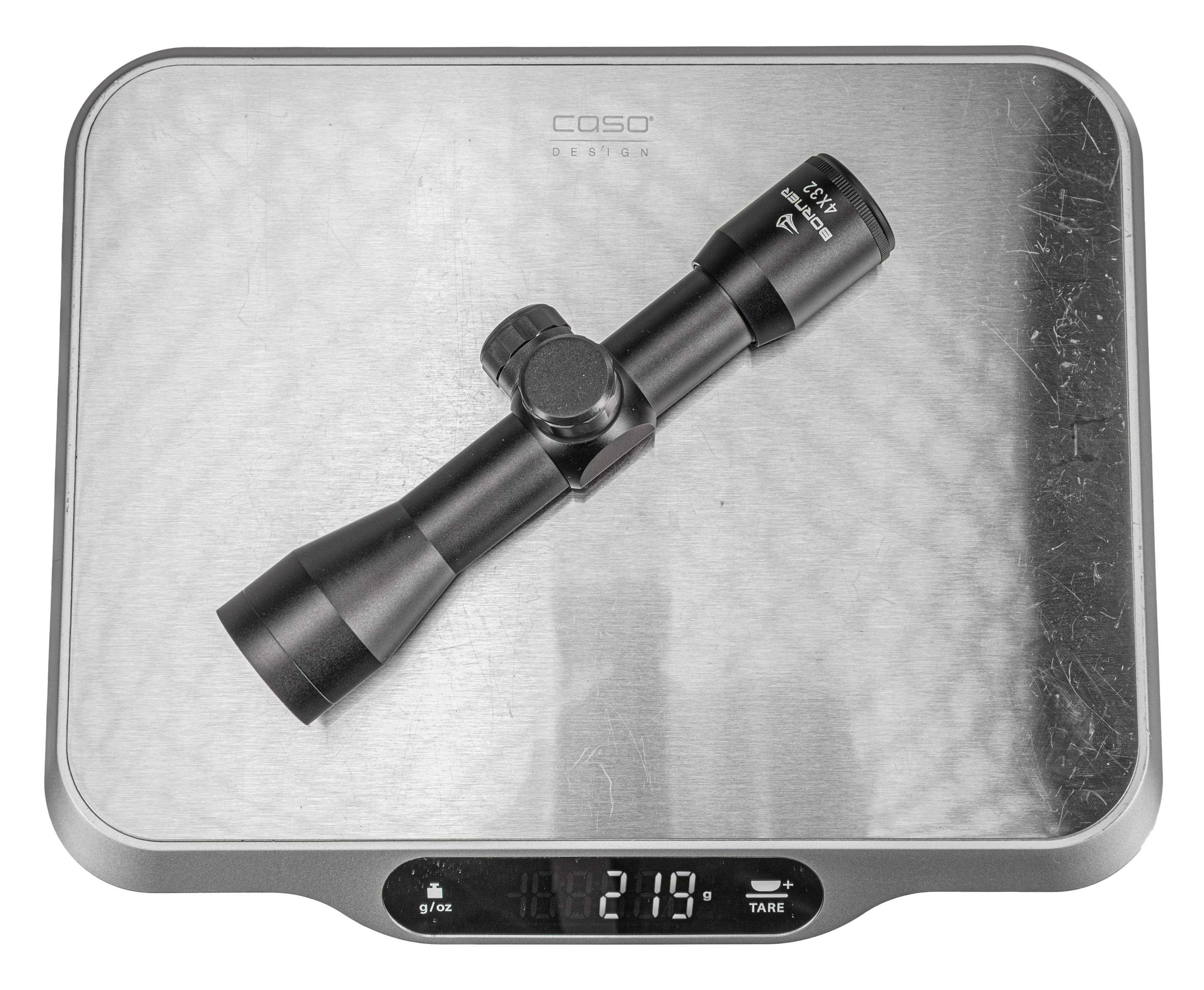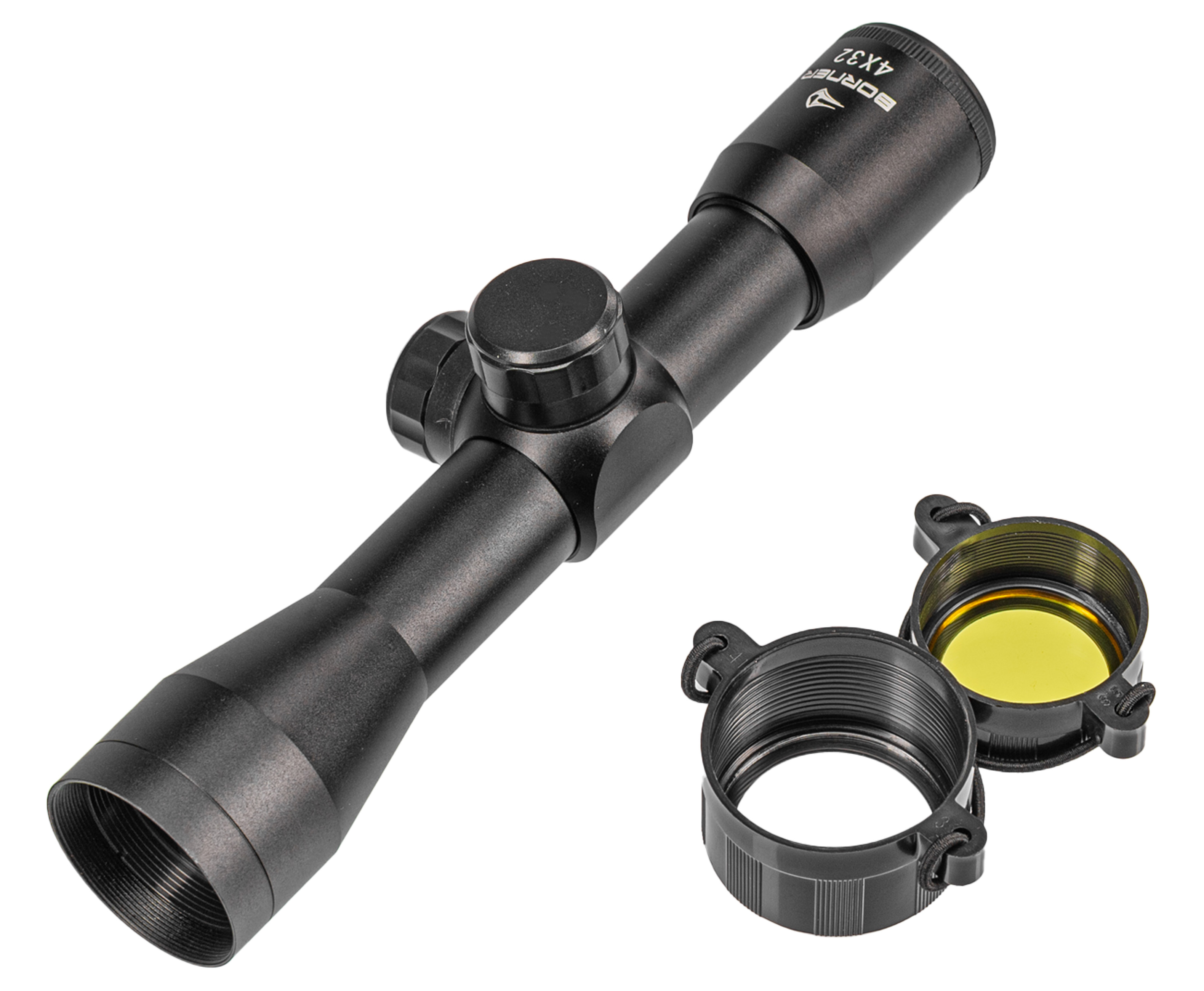 Оптический прицел 4x32 предприятия Borner делают из металла - применение алюминия стало стандартной практикой в изготовлении подобных аксессуаров ввиду его сопротивления к развитию коррозии. Последнее имеет значения не только с точки зрения сохранности корпуса, но и поддержания герметичного состояния трубы, т.к. в ее пространство закачивают газ - такое наполнение не даст линзе запотеть изнутри. Масса этого образца - 0.24 килограмма.
