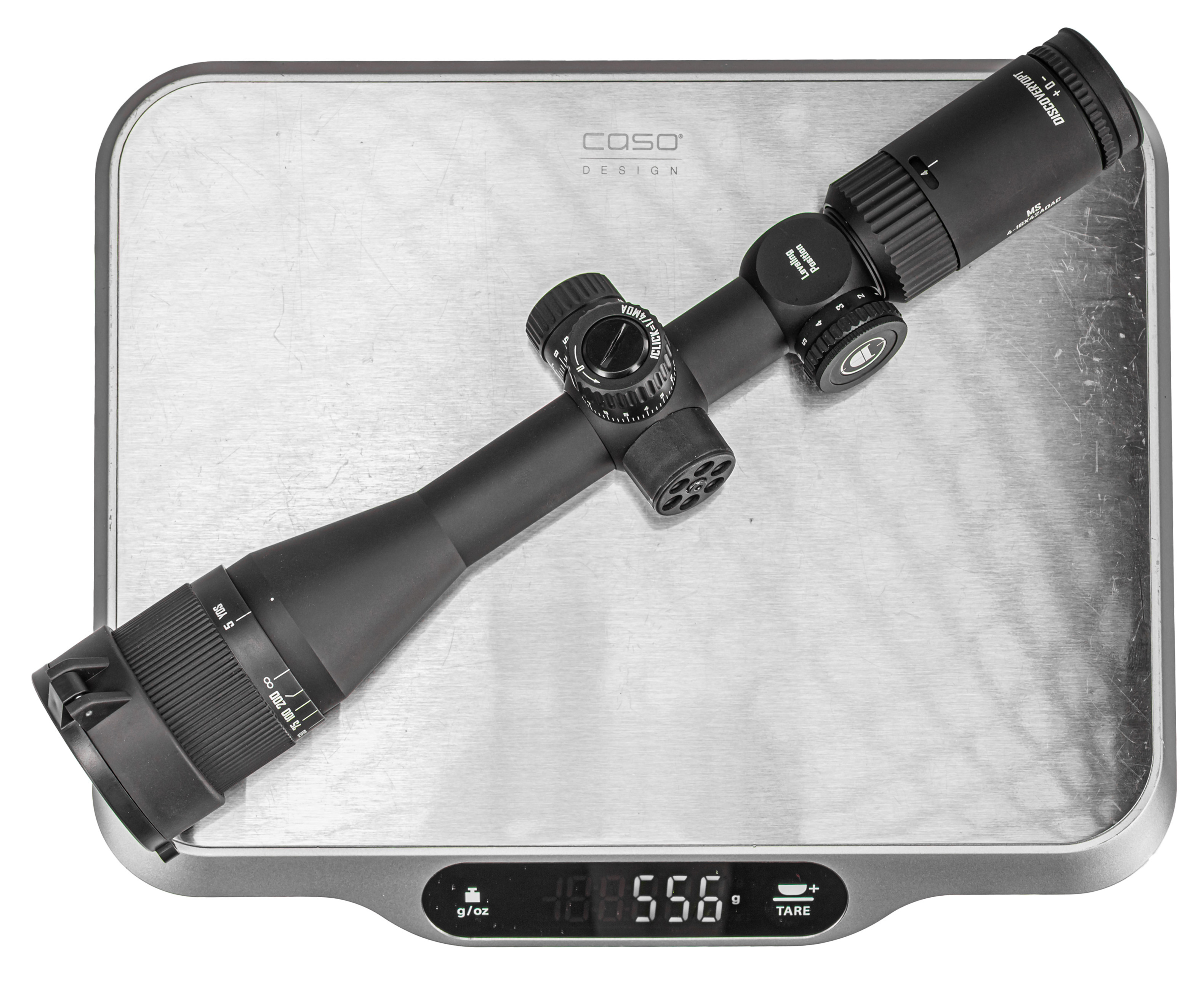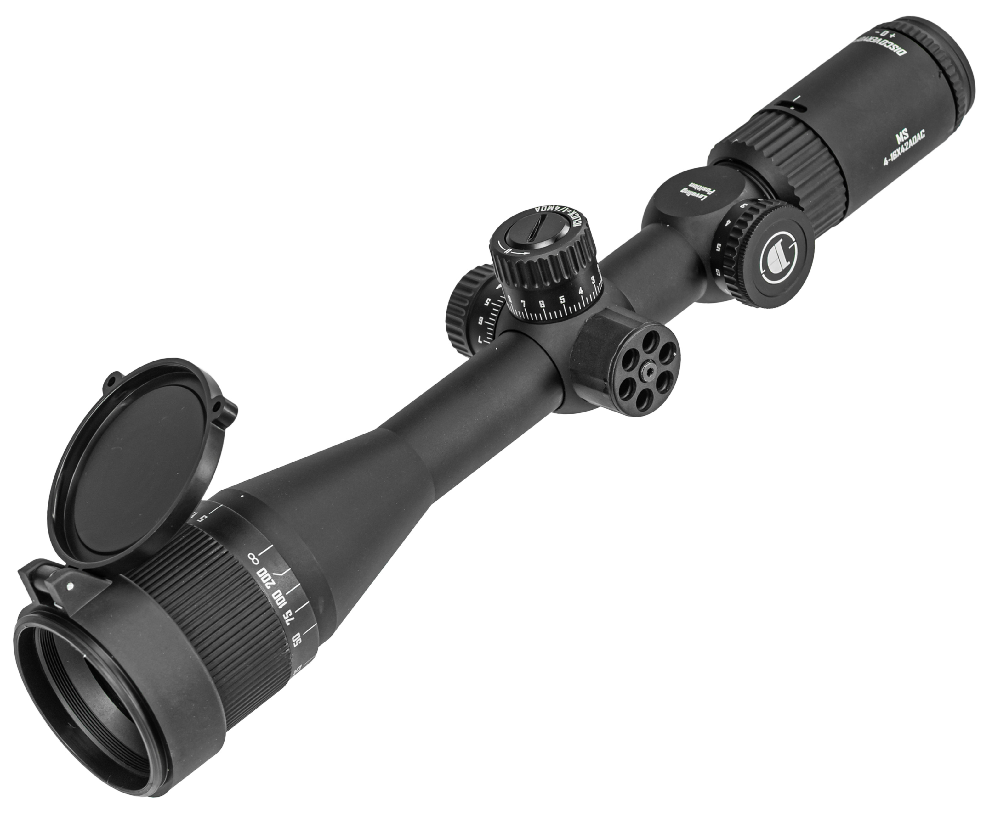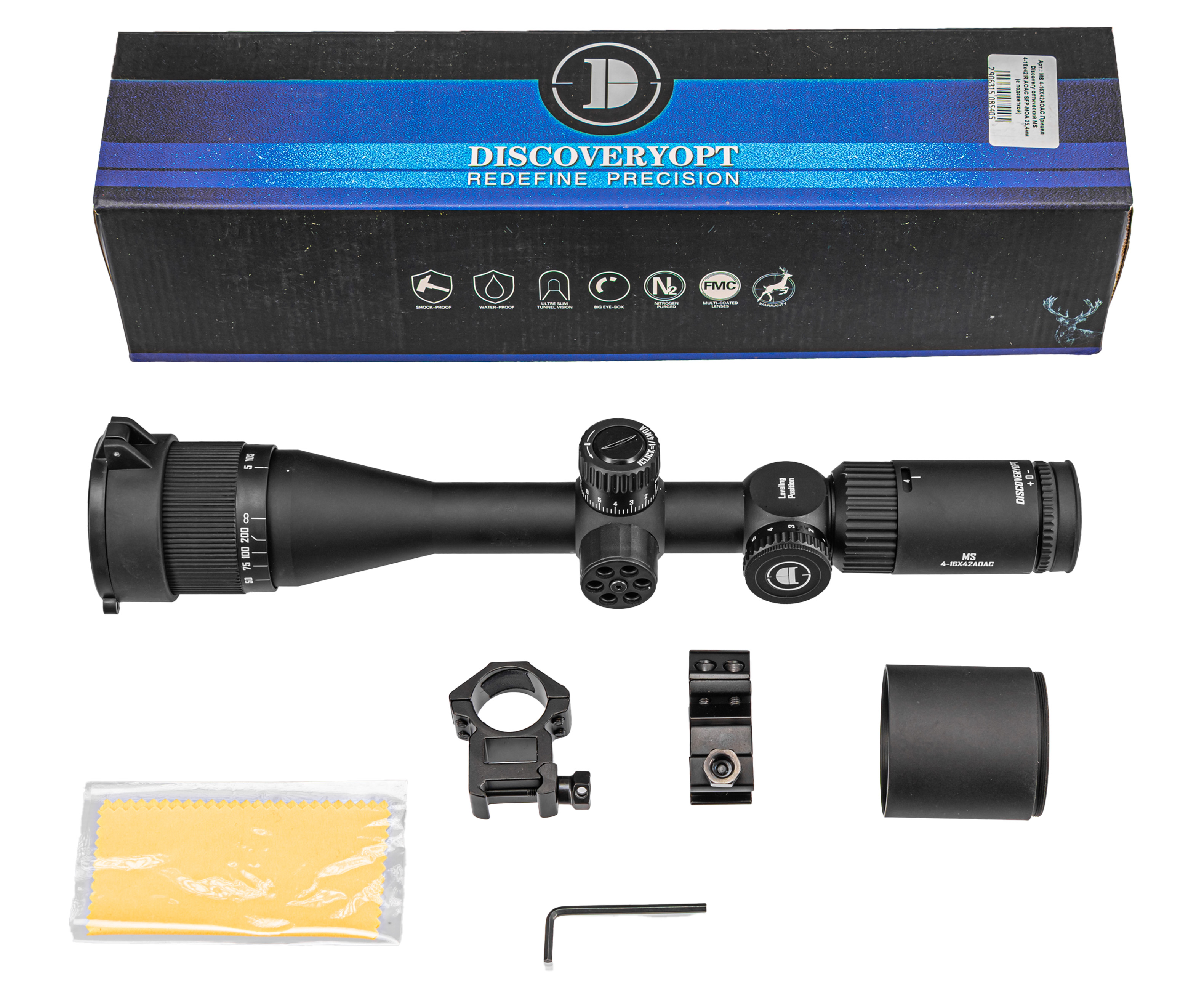 Прицел Discovery MS выполняют из алюминия, что повышает коррозионную стойкость - масса прицела не выходит за границу 570 грамм. В наборе с изделием присутствует пара колец 25.4 миллиметра для крепления на Вивер 22 мм, вместе с чем изготовитель дополнил комплект ключом, салфеткой для ухода, и блендой. Последняя поможет избавиться от бликования оптики в солнечную погоду.