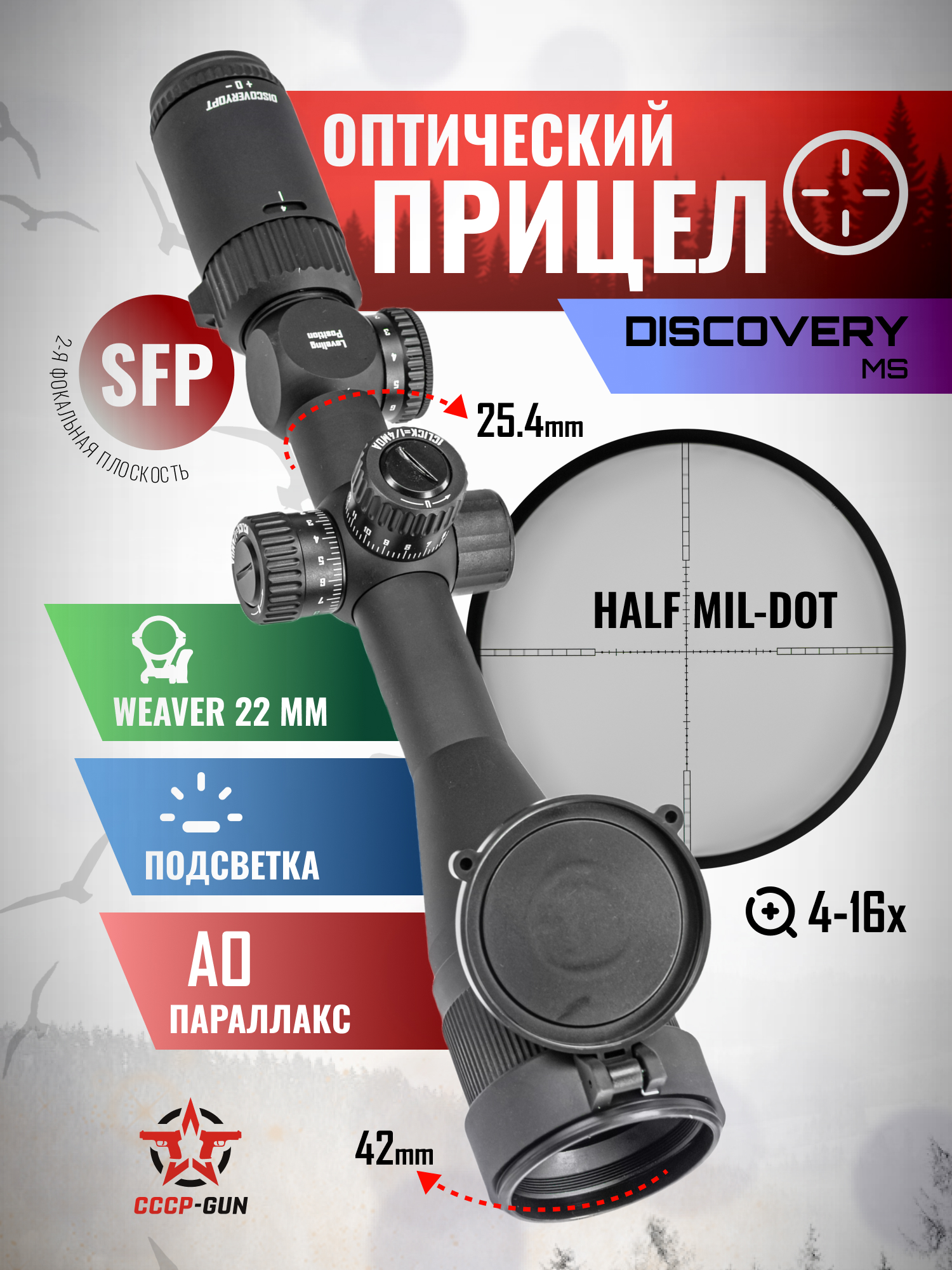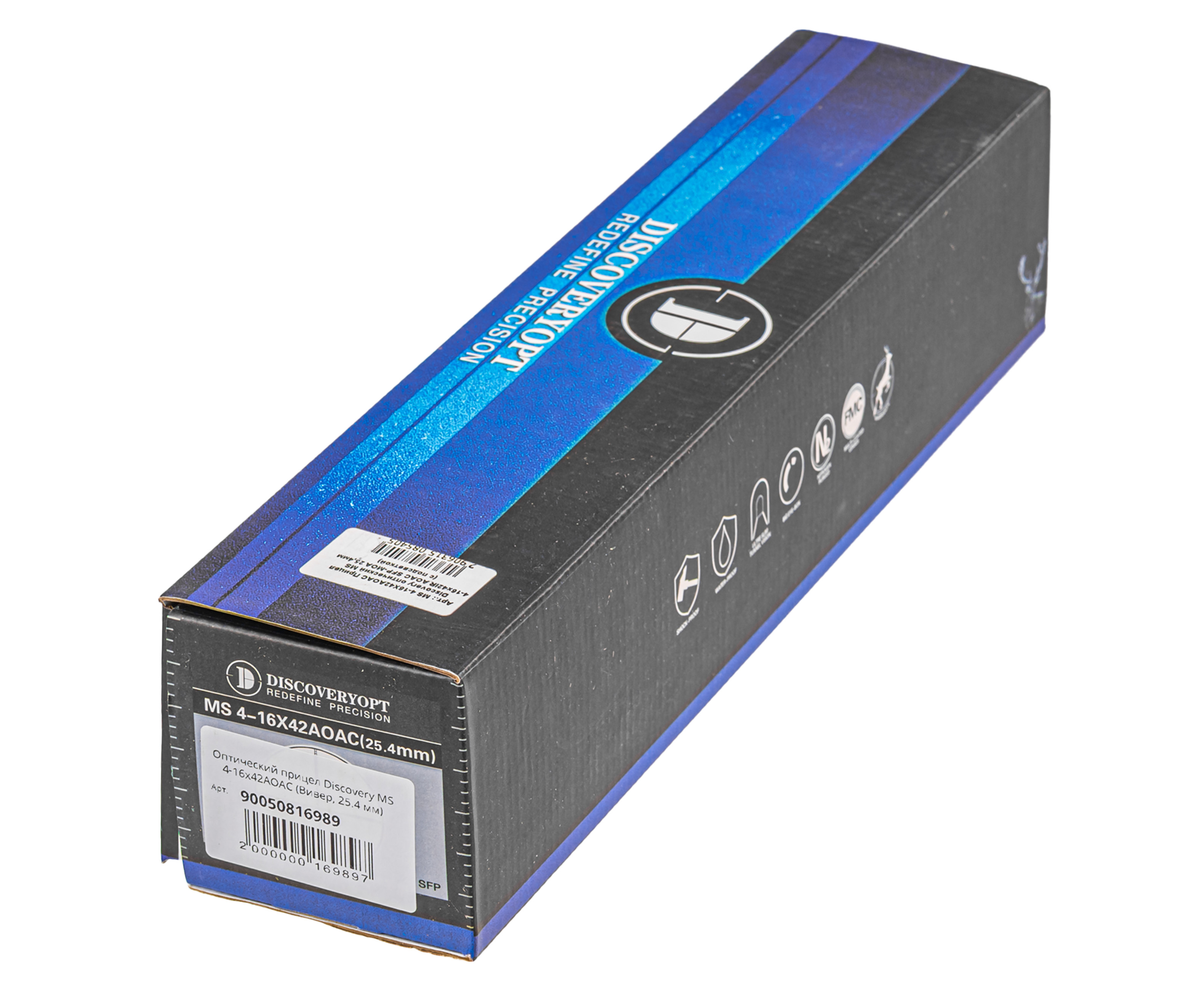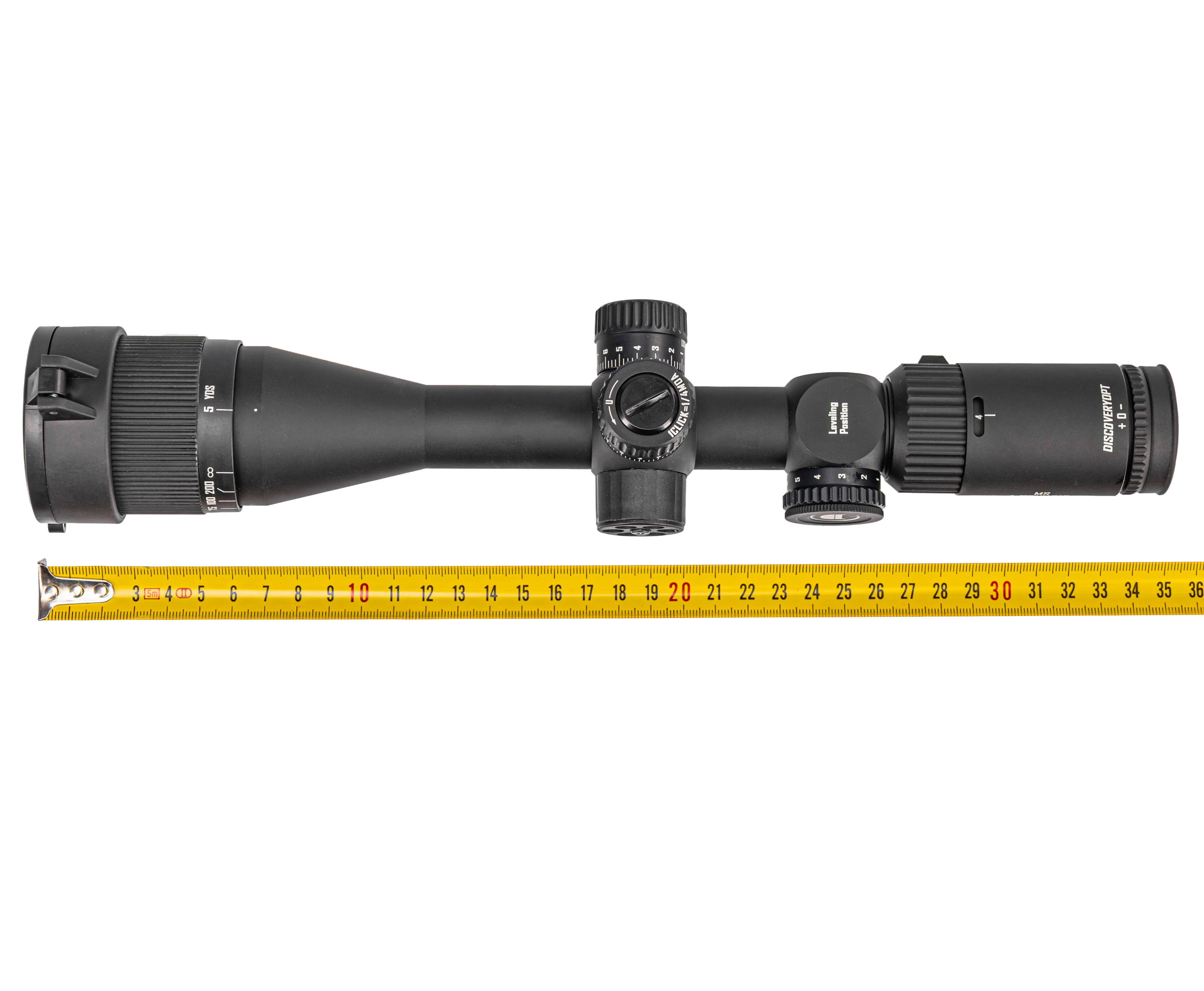 Прицел Discovery MS выполняют из алюминия, что повышает коррозионную стойкость - масса прицела не выходит за границу 570 грамм. В наборе с изделием присутствует пара колец 25.4 миллиметра для крепления на Вивер 22 мм, вместе с чем изготовитель дополнил комплект ключом, салфеткой для ухода, и блендой. Последняя поможет избавиться от бликования оптики в солнечную погоду.