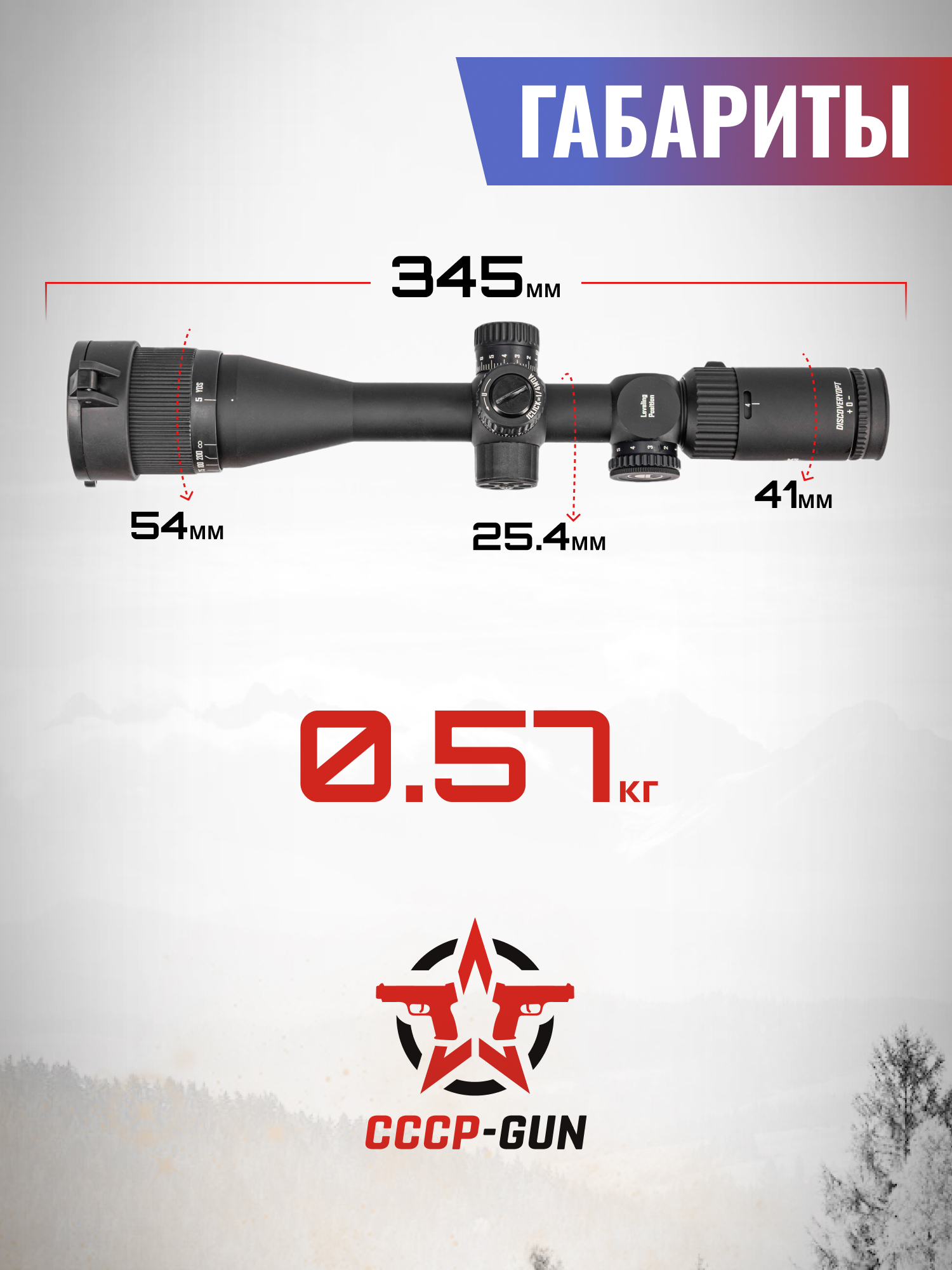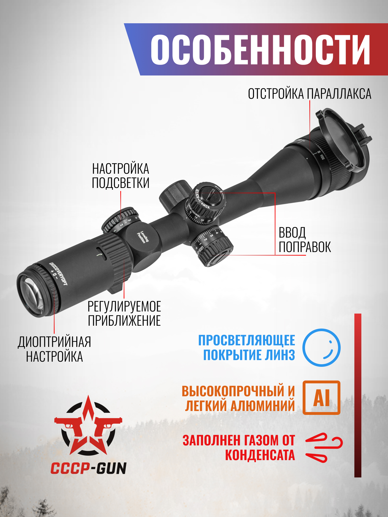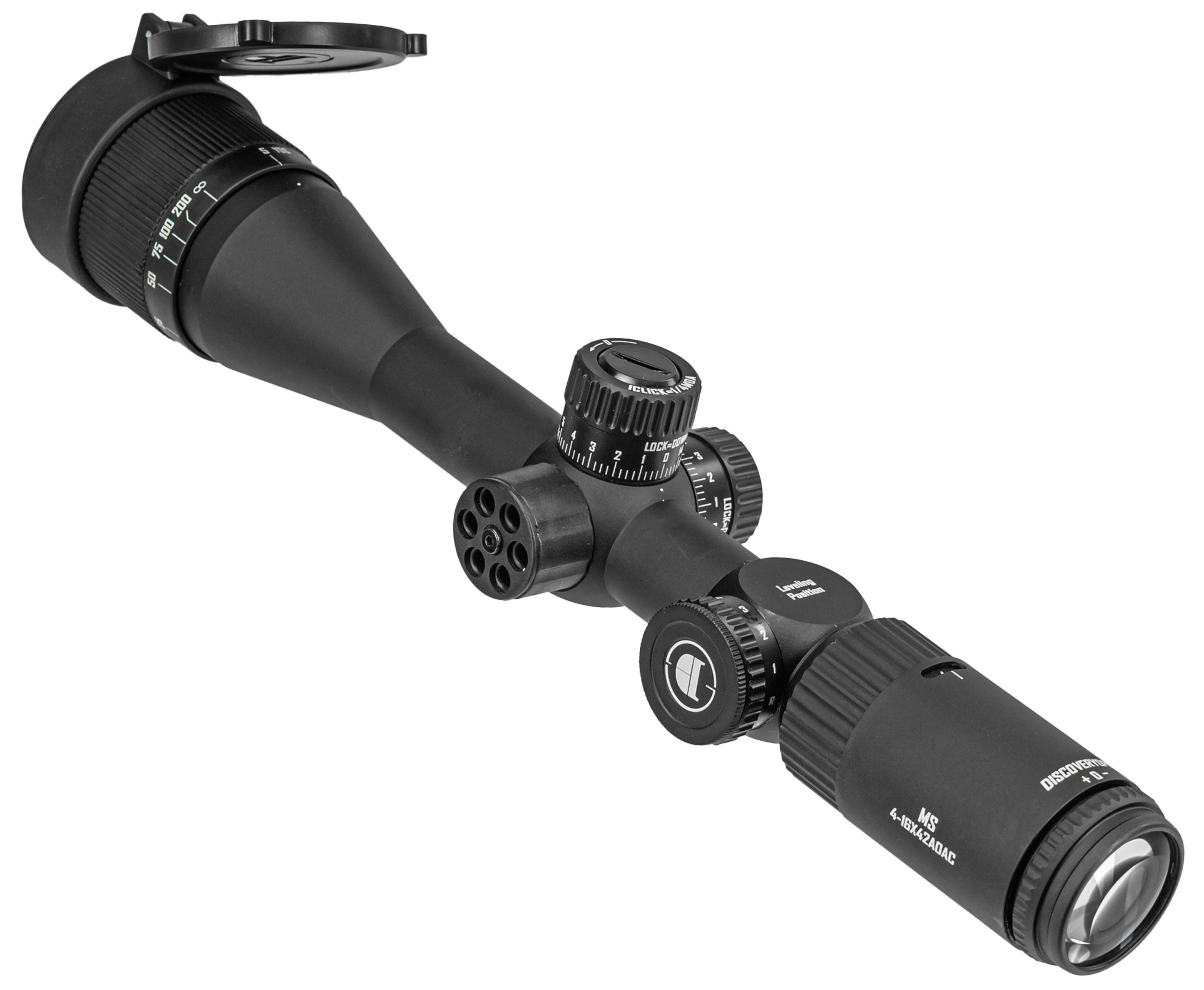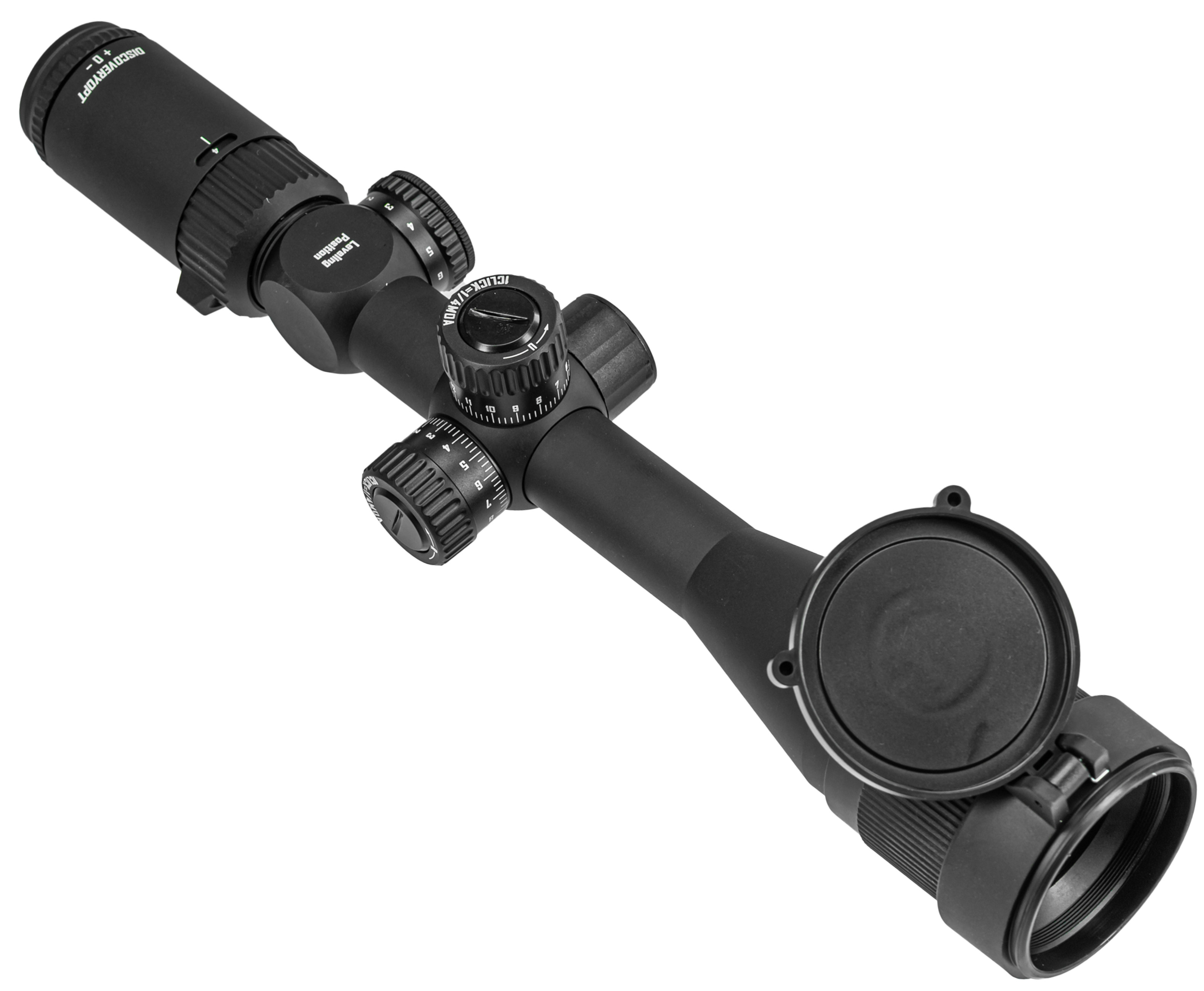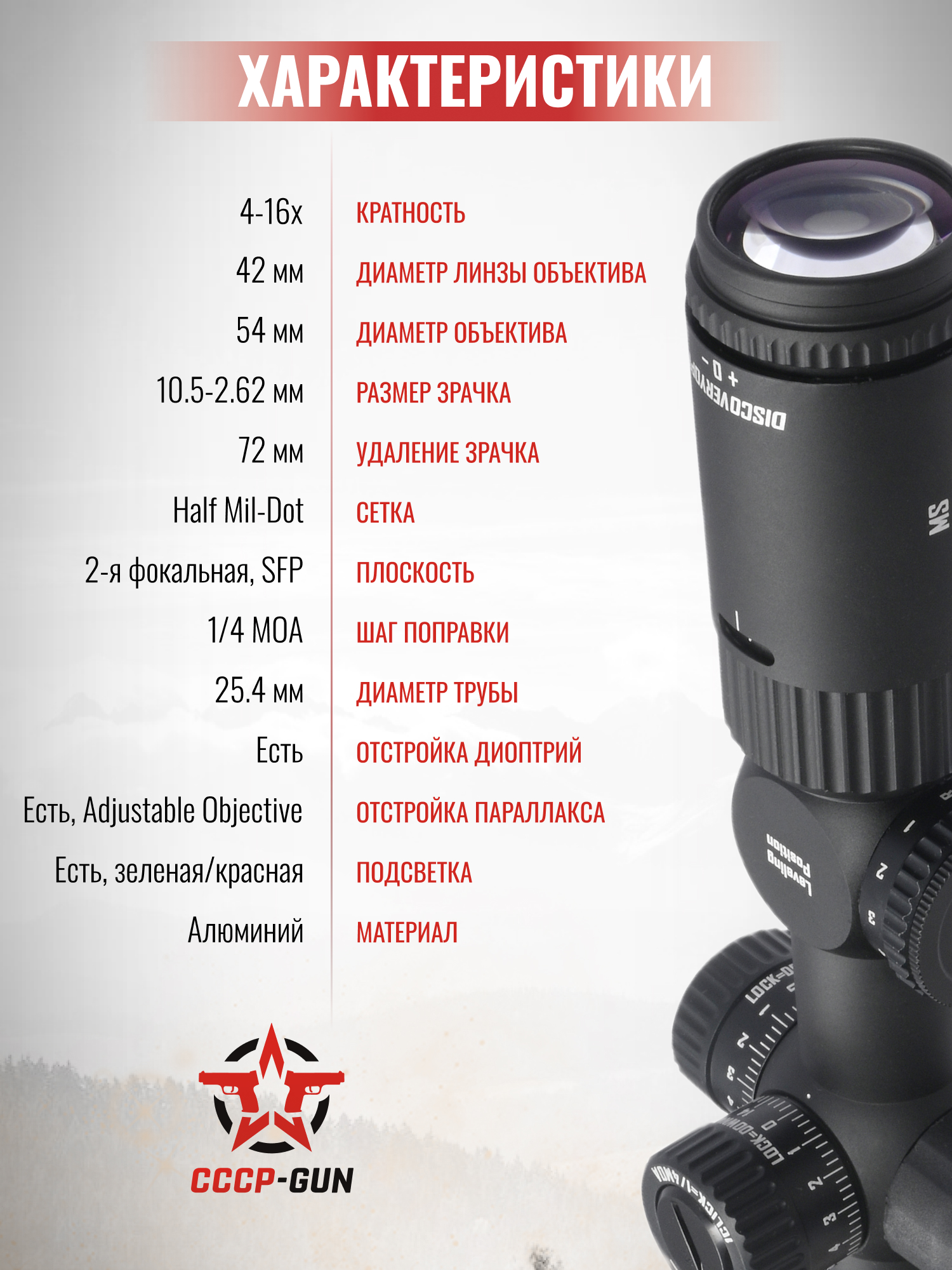 Оптический прицел Discovery привлекателен расширенным диапазоном увеличения изображения - 4-16х, за счет чего пользователь сможет раскрыть потенциал кучности оружия на пределе его дистанций. Напротив кольца изменения кратности присутствует смотровое окошко, в котором указывается выбранное увеличение. Также за ним разместили диоптрийную настройку.
