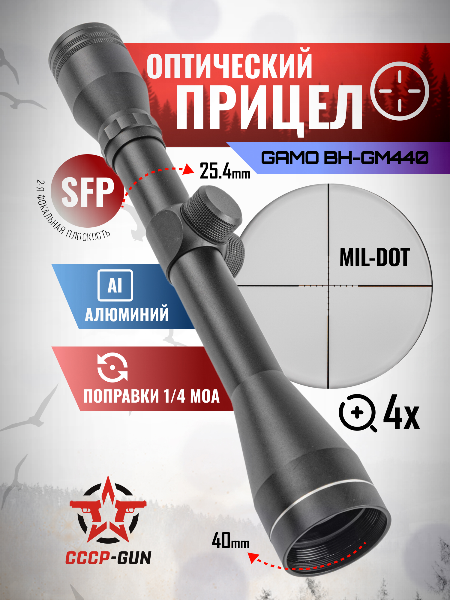 Оптический прицел, произведенный в КНР по заказу испанской компании Gamo, которая специализируется на производстве различных пневматический винтовок и пистолетов, а так же дополнительного оборудования.