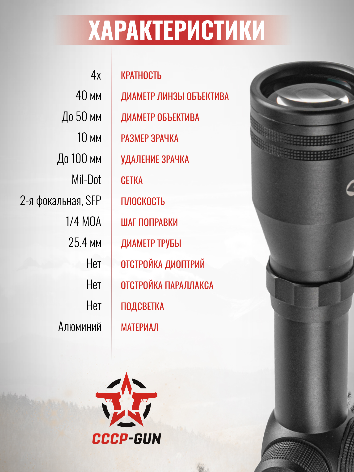 Кратность прицела постоянна и равна 4. Диаметр объектива составляет 40 мм, что обеспечивает отличный угол обзора. Прицельная сетка модели - Duplex, то есть, классическое, всем знакомое перекрестие без излишеств.