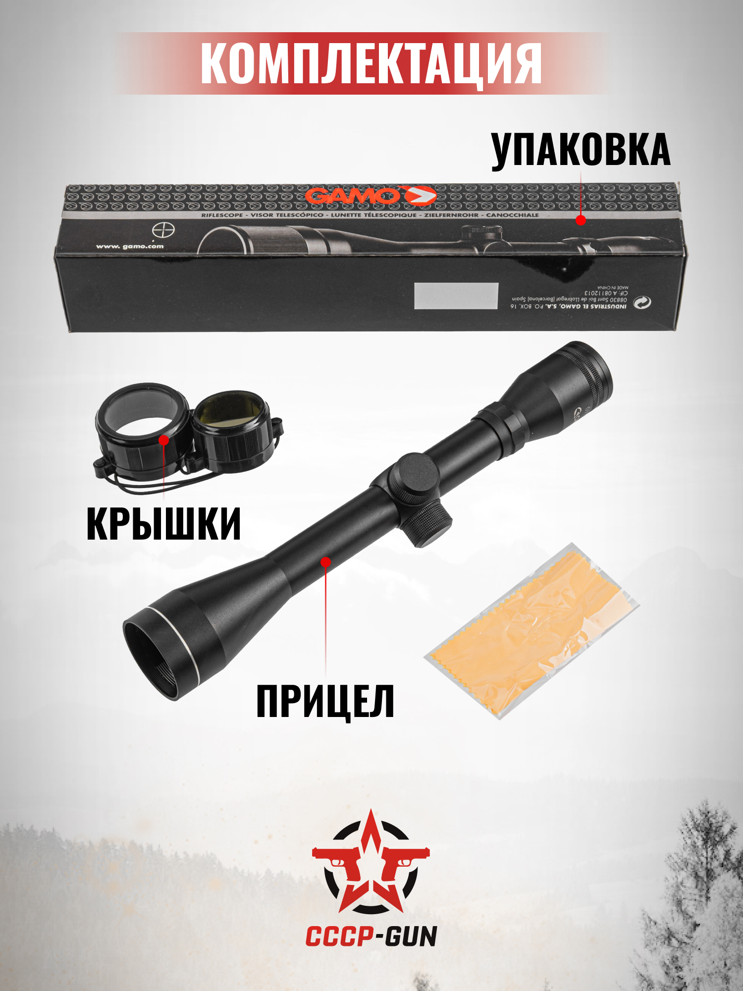 Комплект поставки модели Gamo 4x40 включает в себя: сам прицел, инструкцию, защитные крышки, которые предназначены для предохранения линз модели от мелких частиц, царапин и иных повреждений, а так же салфетку из микрофибры, которая предназначена для ухода за оптикой прицела.