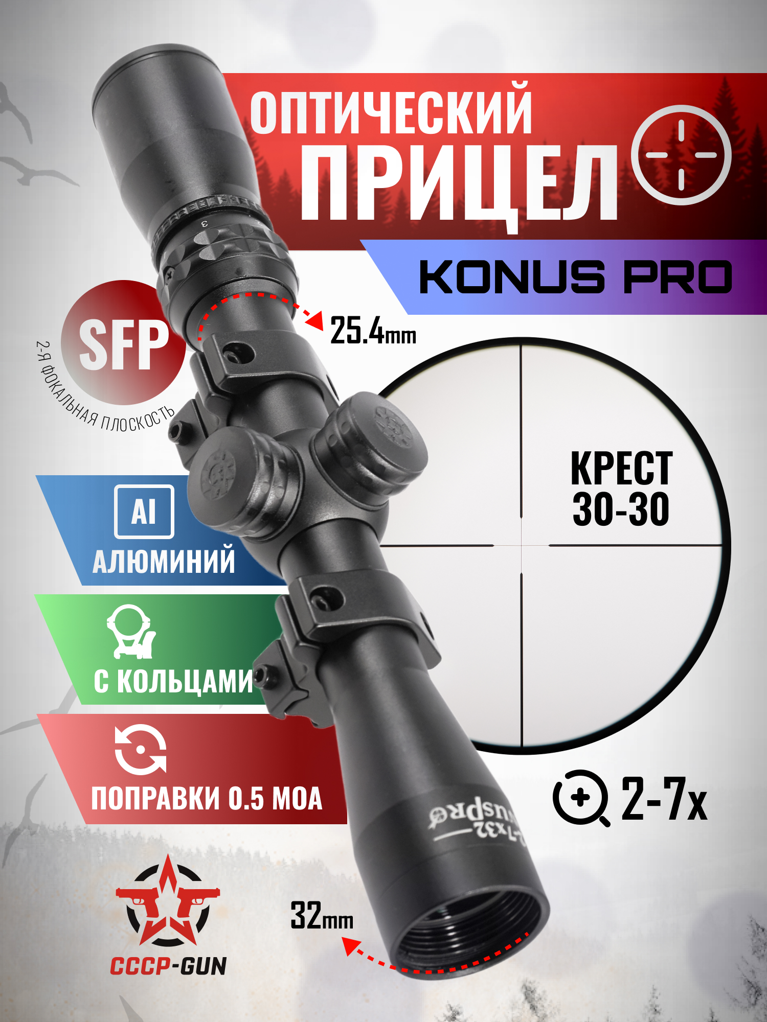 Оптический прицел Konus Pro 2-7x32 (25.4 мм, 30-30, Ласточкин Хвост)
