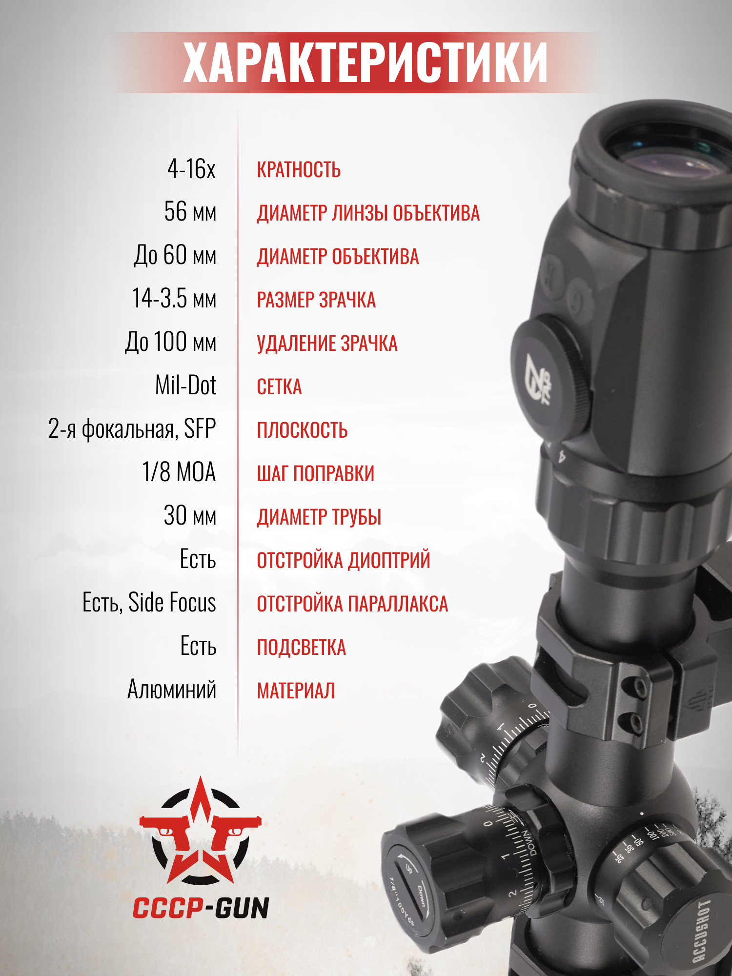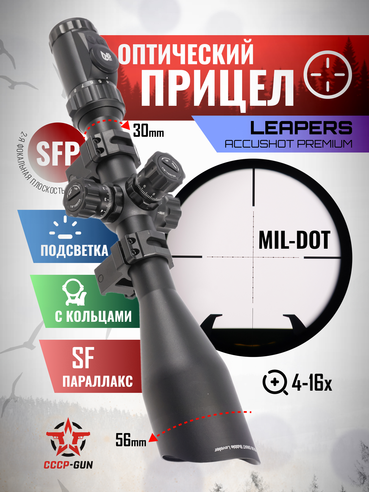Оптический прицел с большим объективом в 56 мм и подсветкой имеющей 36 цветов Leapers 4-16x56 Accushot Premium производится в Китае под контролем кампании Leapers. Они и широкий угол обзора и переменную кратность позволяющую вести стрельбу на средних и дальних дистанциях.