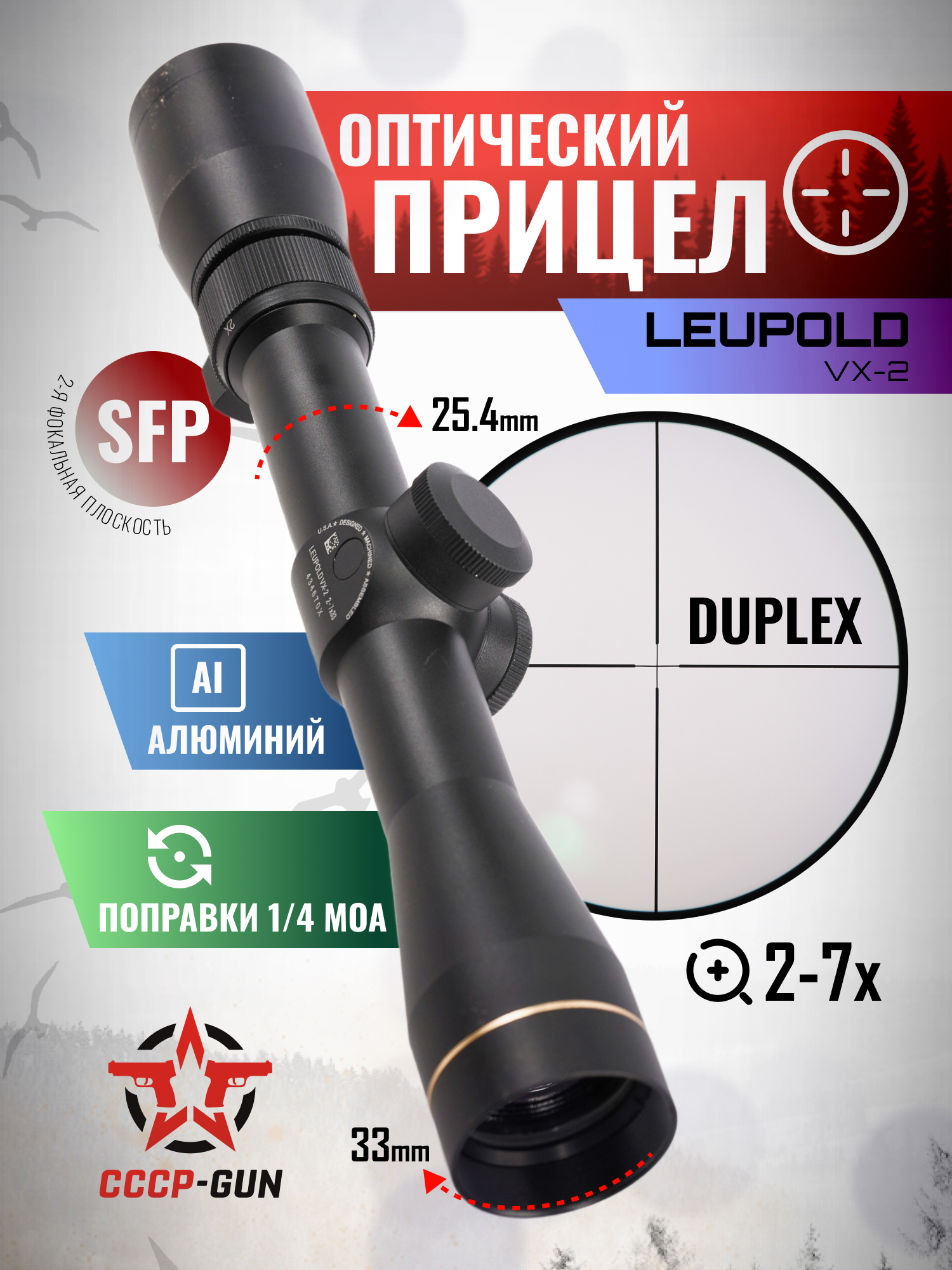 Оптический прицел Leupold 2-7x33 VX-2 имеет прочный корпус изготавливаемый из сплава 6061 Т6 на основе алюминия. От коррозии его защищает специальное покрытие. Кроме того, финальная обработка производится напылением черного матового красителя. Этим достигается антибликовый эффект поверхности. Длина корпуса 287 мм. Центральная трубка имеет монолитную конструкцию которая помогает всему прибору выдерживать высокие механические нагрузки. Диаметр трубы относится к стандарту 25.4 мм и позволяет без проблем подобрать крепежные кольца для установки прицела на оружие.
