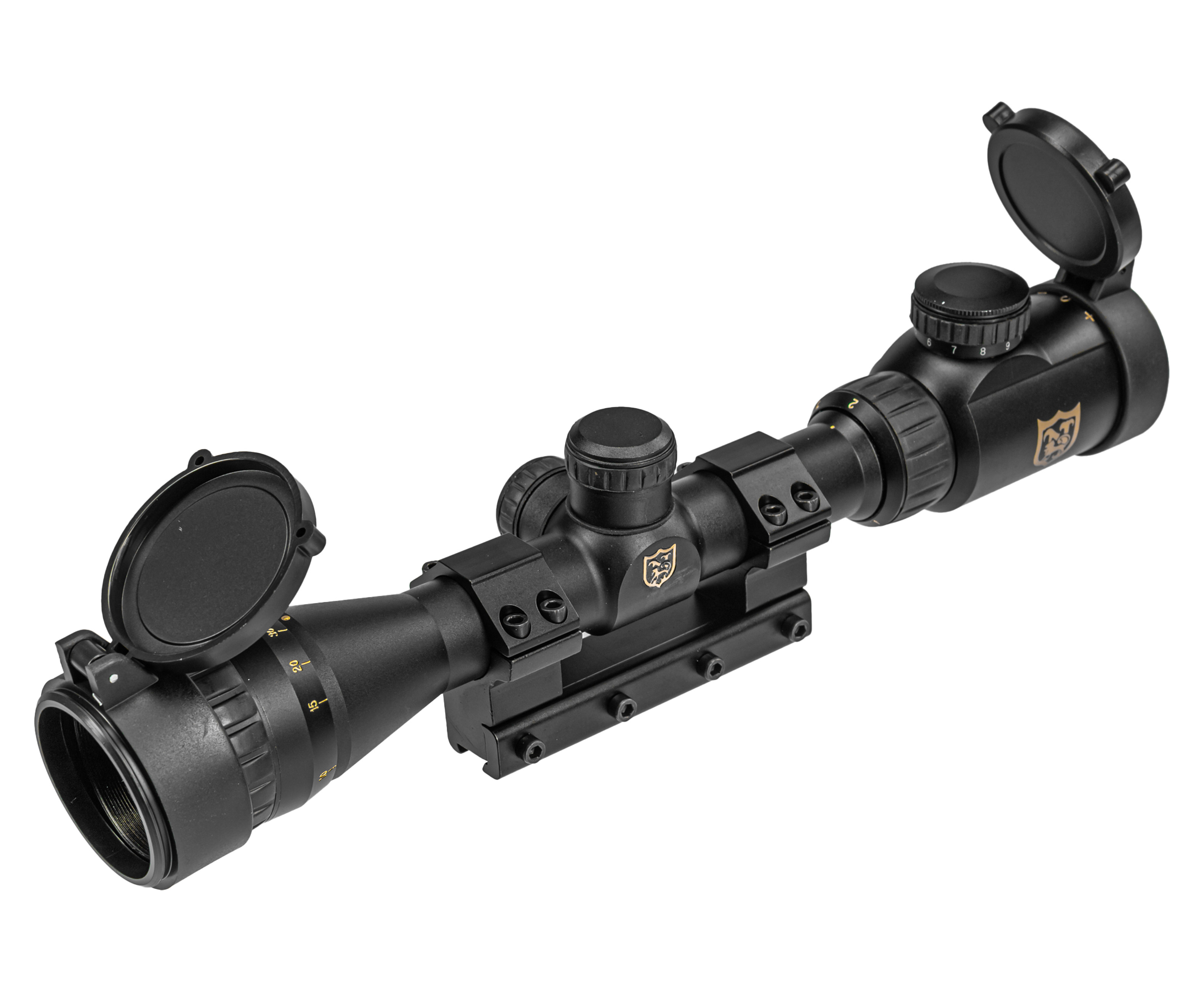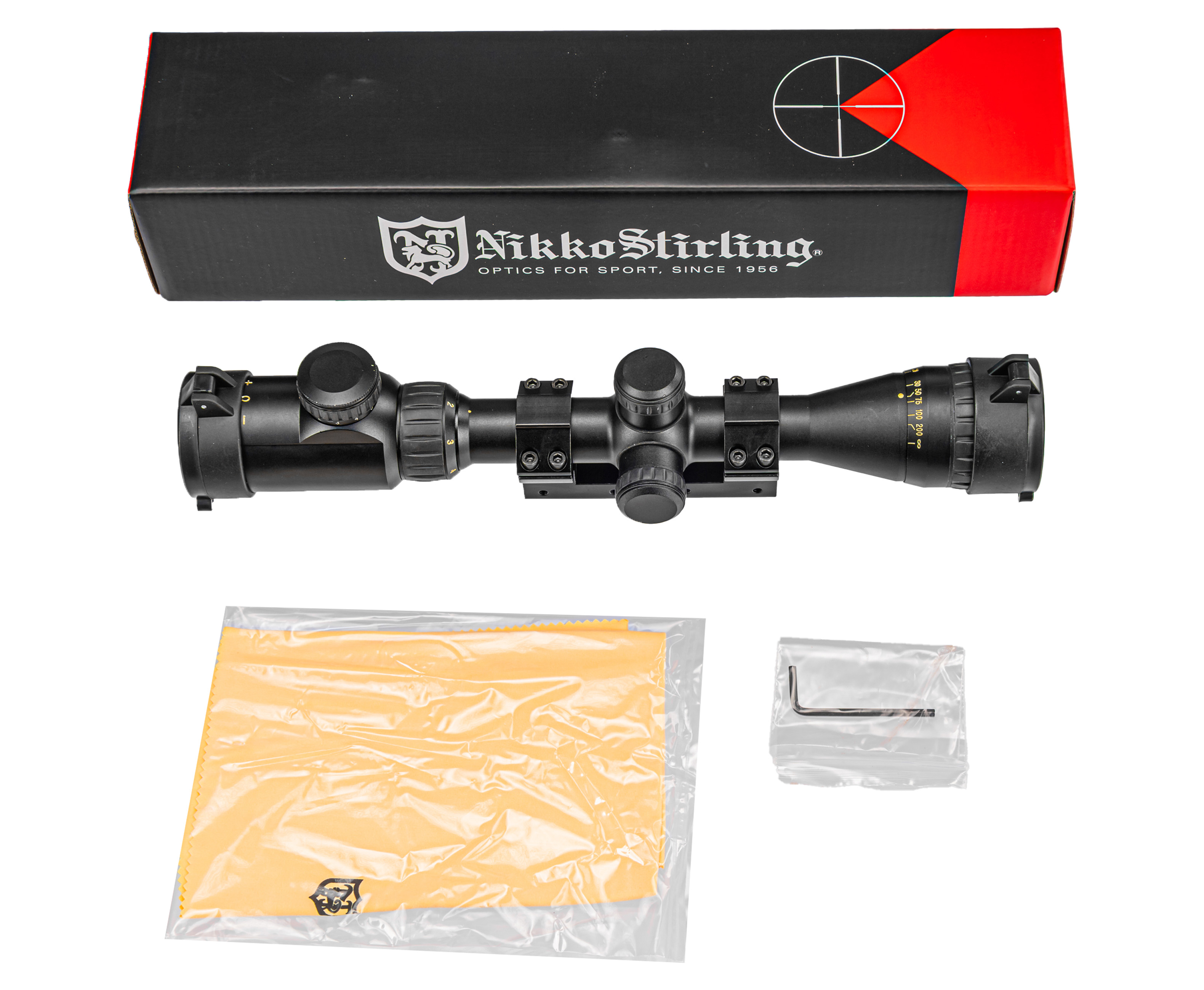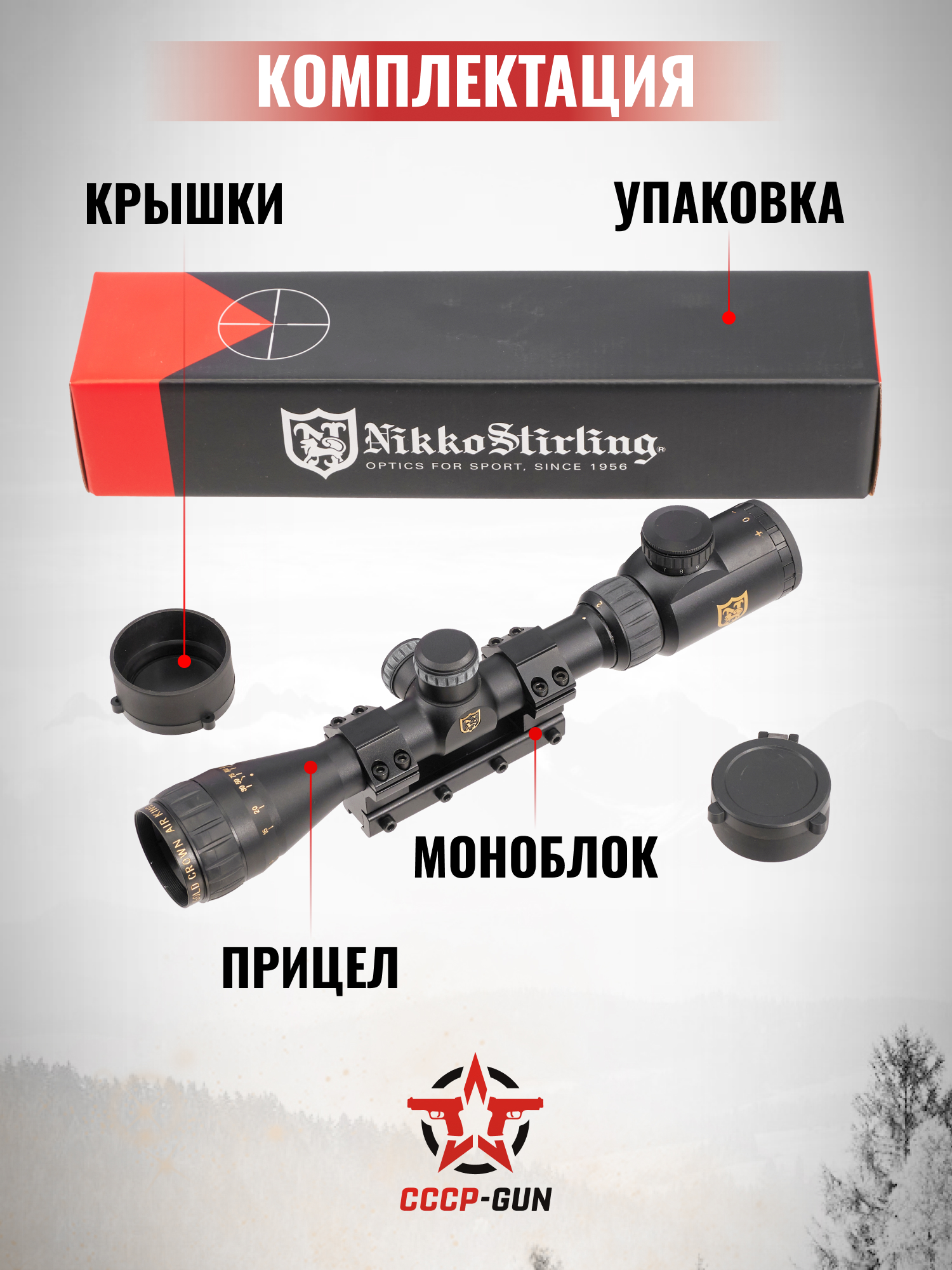 Оптический прицел с подсветкой и переменной кратностью, производимый японской компанией Никко Стирлинг. Модель поставляется вместе с моноблоком, необходимым для установки модели на оружие, под планку типа Ласточкин хвост шириной 11 мм, двумя защитными крышками и тряпочкой из микрофибры.