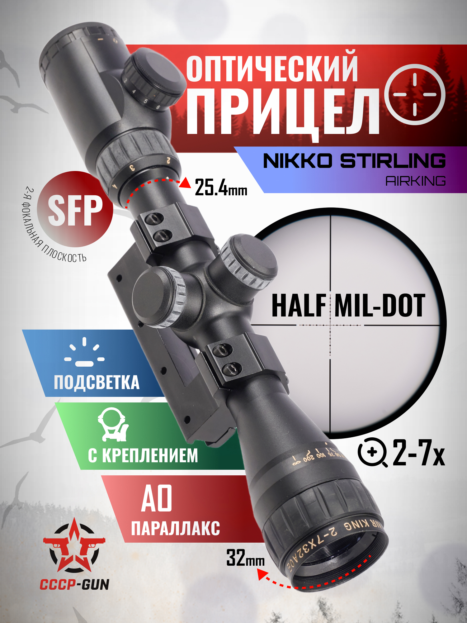 Диаметр передней линзы оптического прицела Никко Стирлинг Айркинг 2-7х32 АО ИР равен 32 мм. Важно сказать, что модель оснащена функцией отстройки от параллакса. Прицельная марка модели - Half MilDot.