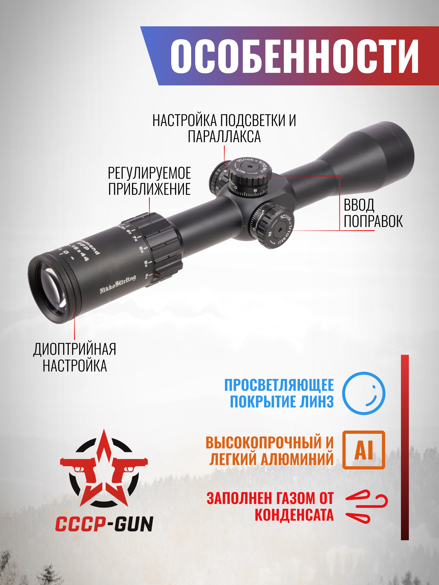 Представленная оптика Никко Стирлинг предусматривает регулируемую кратность видимой сцены в интервале от 4 до 16 единиц, из-за чего предполагается ведение стрельбы как на средние, так и на большие дистанции. Изменение степени приближения картинки выполняется с помощью кольца на трубчатом расширении перед окуляром. Указанный орган управления гарантирует уверенный контакт пальцев даже во время дождя или при использовании перчаток за счет рельефной поверхности.