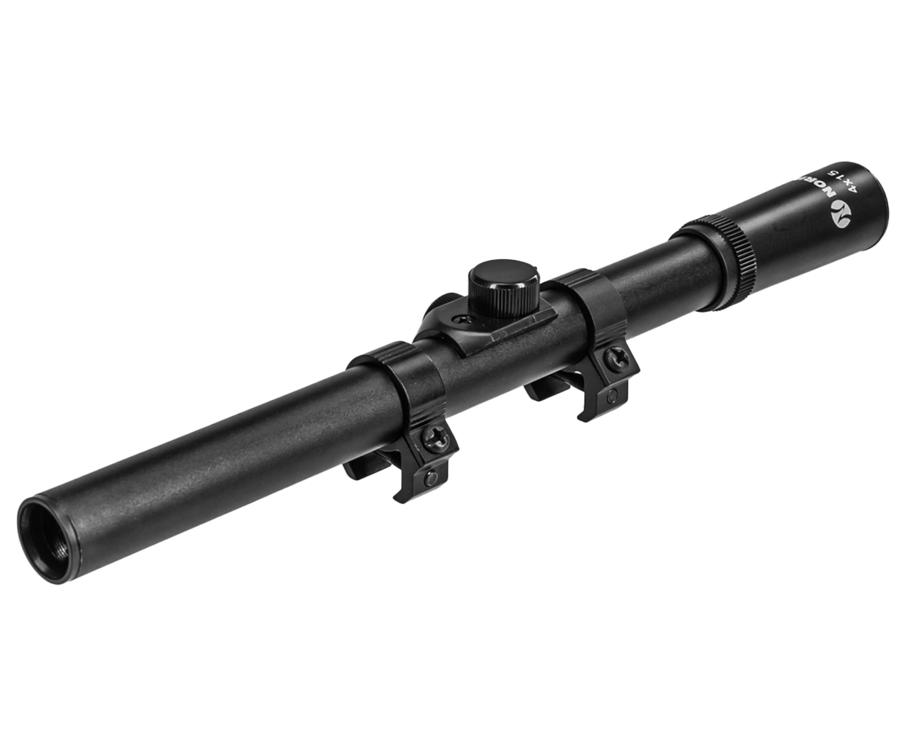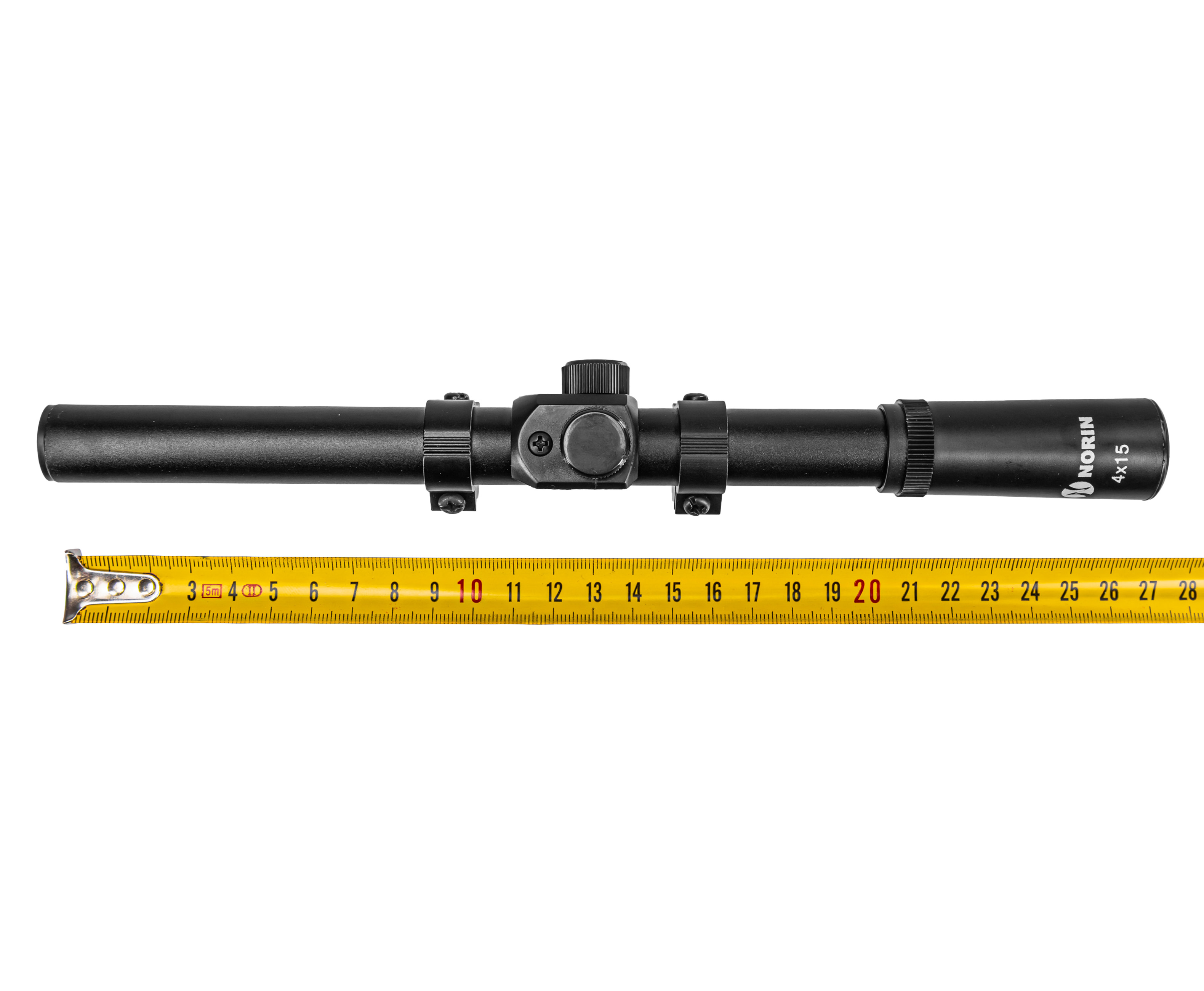 Диаметр трубки составляет 15 мм. Важно заметить, что оптический прицел Norin 4х15 поставляется с уже установленными на него кольцами, которые предназначены для установки модели на планку типа Ласточкин хвост 11 мм.