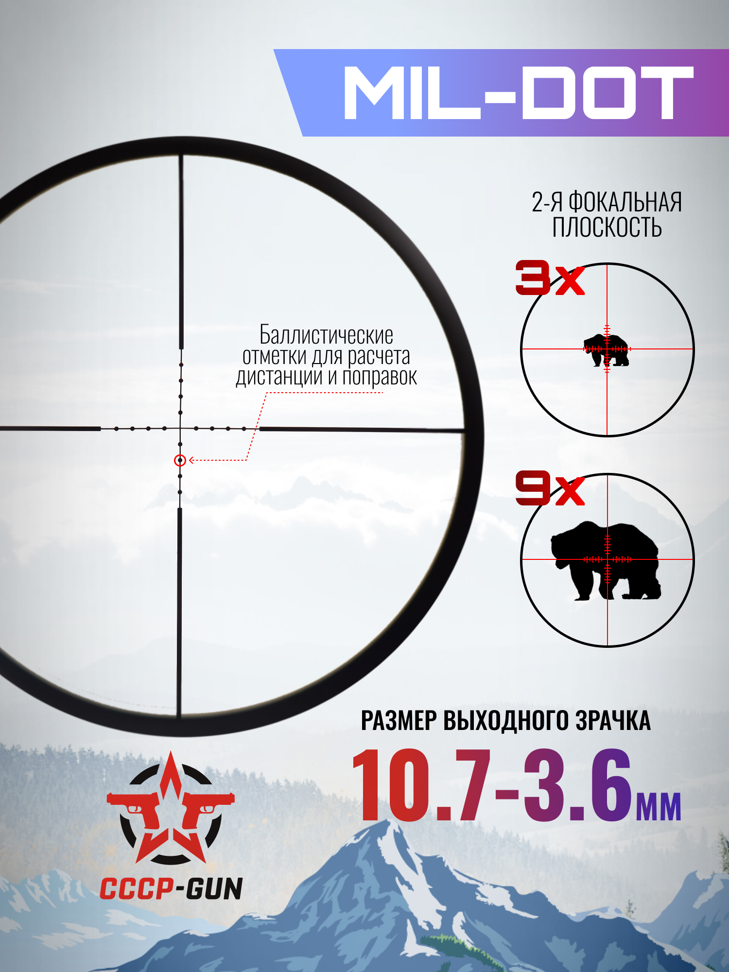 Прицельная сетка оптического устройства привычна для большинства людей, которым ранее доводилось использовать оптику. Как это понятно из названия, она имеет тип Mil-Dot. В данном варианте сетка представляет из себя классическое перекрестие с дополнительными пометками в нижней части, которые очень помогают стрелку при прицеливании на разные дистанции.