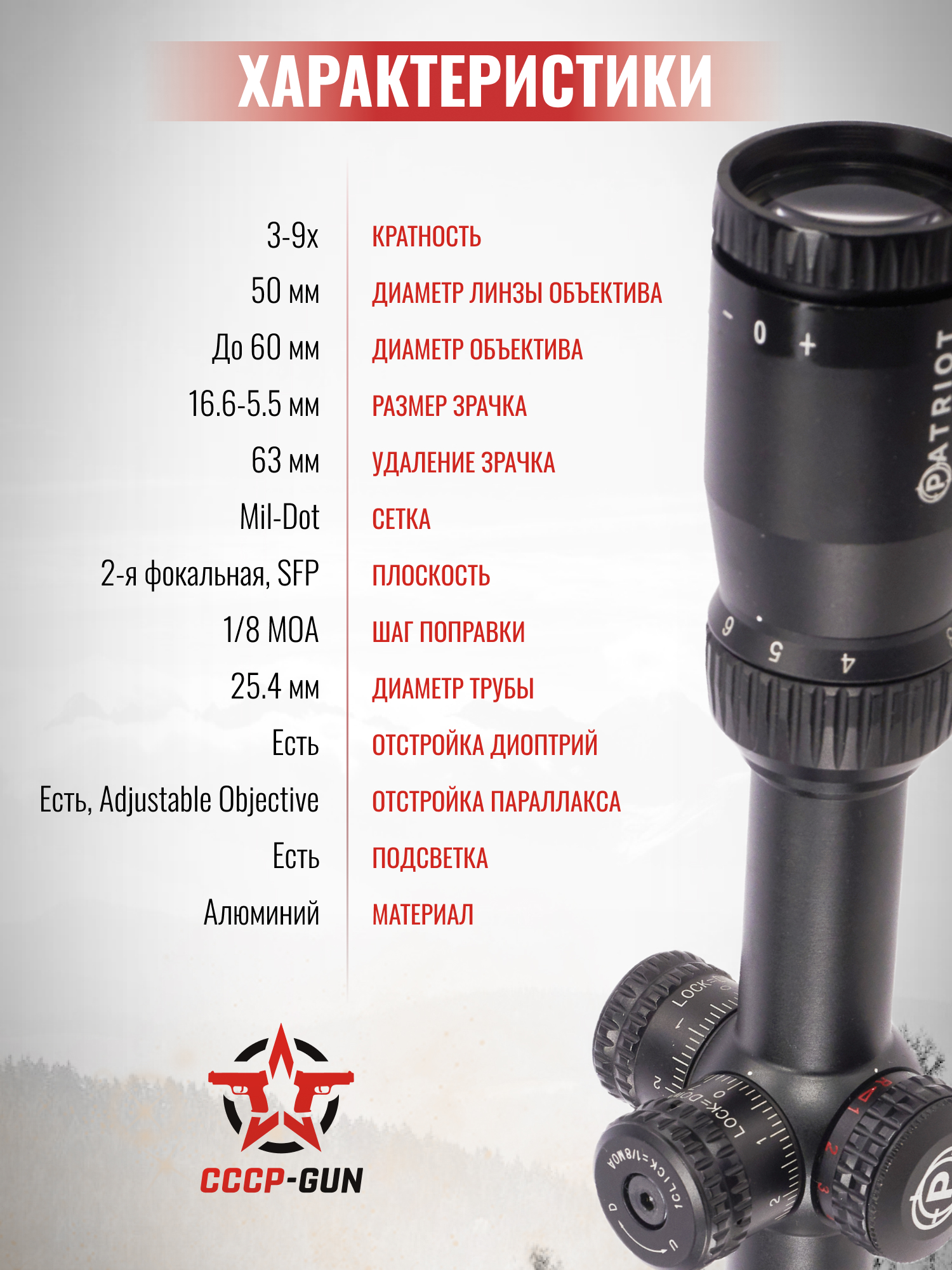 Оптический прицел Patriot P 6-24x50 AOEG (25.4 мм, подсветка, Mil-Dot, BH-PT624G)