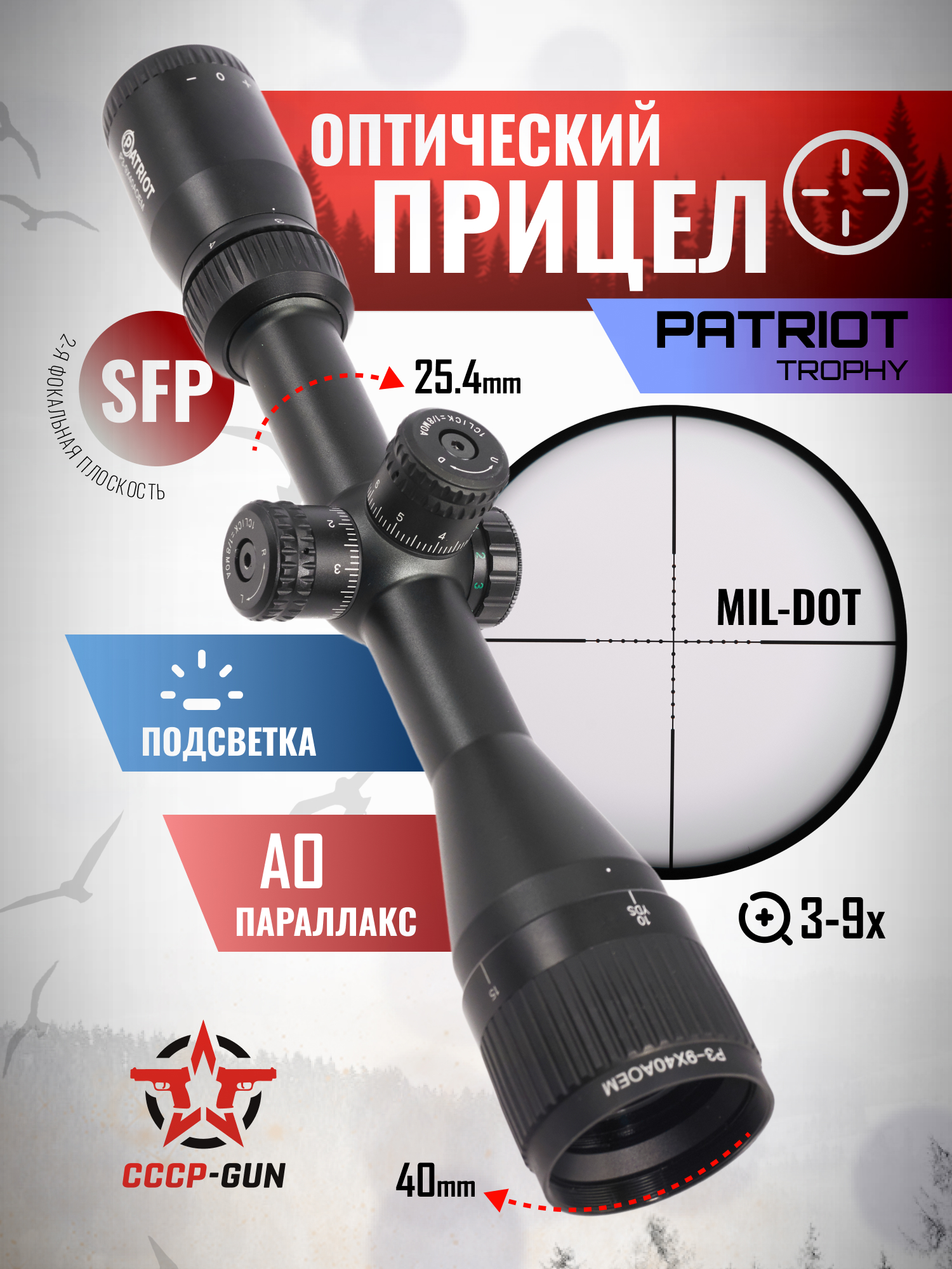 Оптический прицел Patriot Crossfire 3-9x40 LAO (BH-PT394AO, Mil-Dot, 25.4 мм)