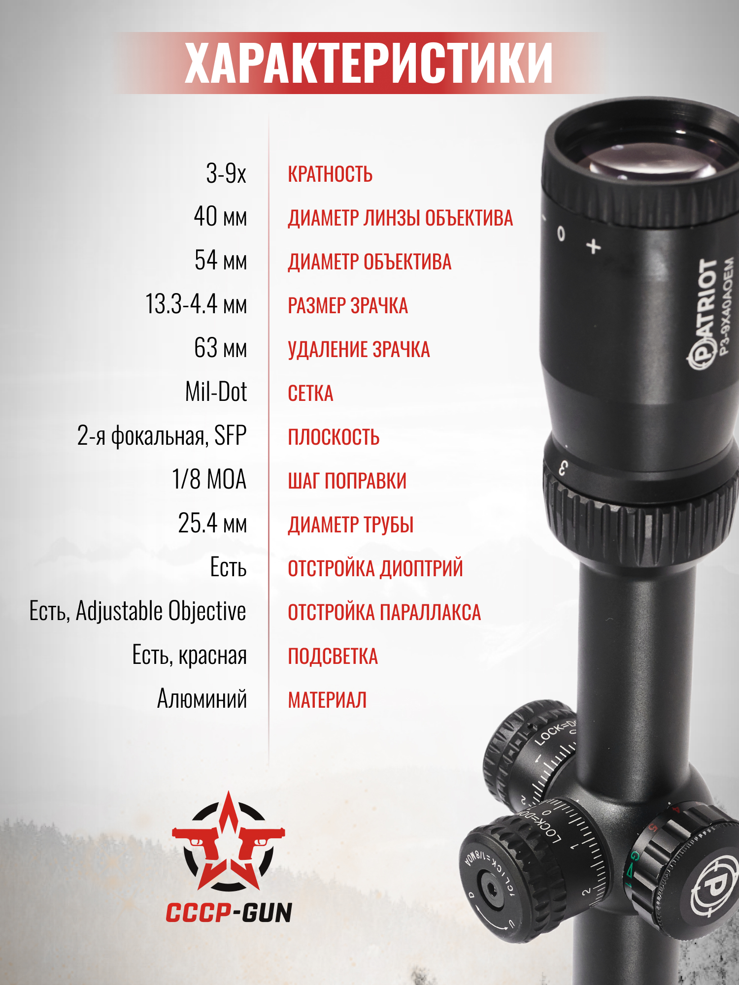 Оптический прицел Patriot P 3-9x40 LAOE (подсветка, Mil-Dot, BH-PT394AOE, 25.4 мм)