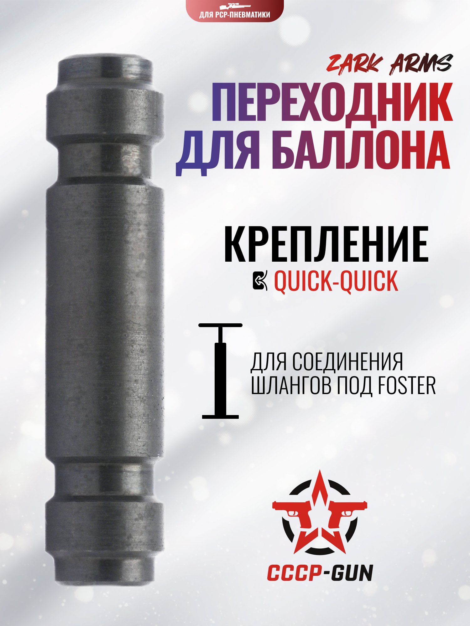 Рассматриваемый ПСП переходник Zark Arms отличается симметричным исполнением - с обеих сторон приспособления выполняются крепежи формата Квик. Таким образом, обозреваемое изделие используется для оперативного соединения между собой двух шлангов, оснащенных наконечниками типа Фостер. Помимо указанного назначения, адаптер может применяться для перекачивания сжатого воздуха из одного баллона ВД в другой.