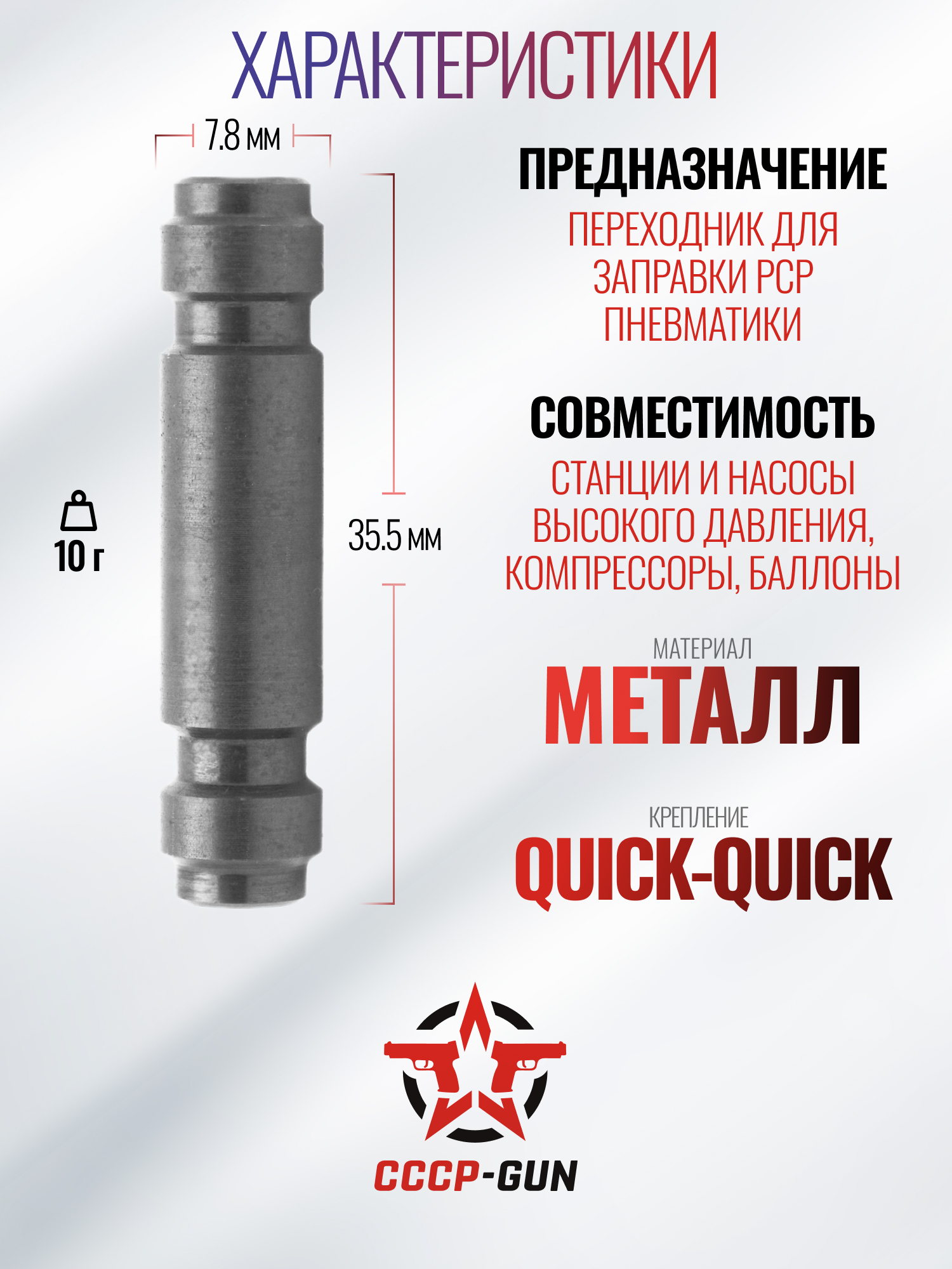 Товарный ряд предприятия включает всевозможные переходные элементы для наполнения воздухом распространенной российской и импортной пневматики категории ПЦП, а также вспомогательные адаптеры. Переходники подобного типа могут применяться для увеличения длины линии от компрессорной установки к воздушной емкости винтовки вкупе с обеспечением совместимости. Именно для этого предназначается рассматриваемая деталь, которая изготавливается из металлического сплава и обрабатывается защитным покрытием от окисления.
