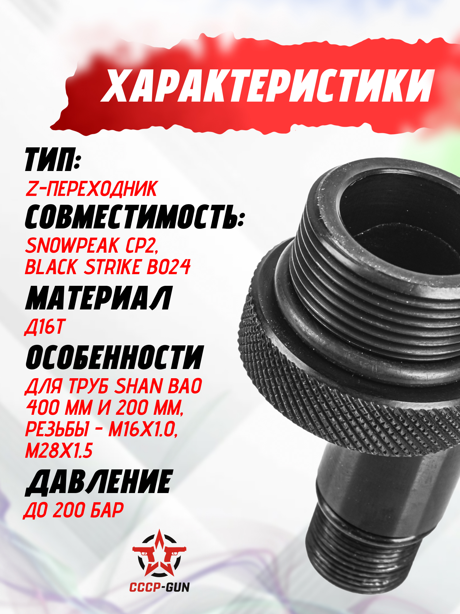 | Особенности конструкции | Для труб Shan Bao 400 мм и 200 мм, резьбы: M16х1.0, М28х1.5, рабочее давление - 200 Бар |