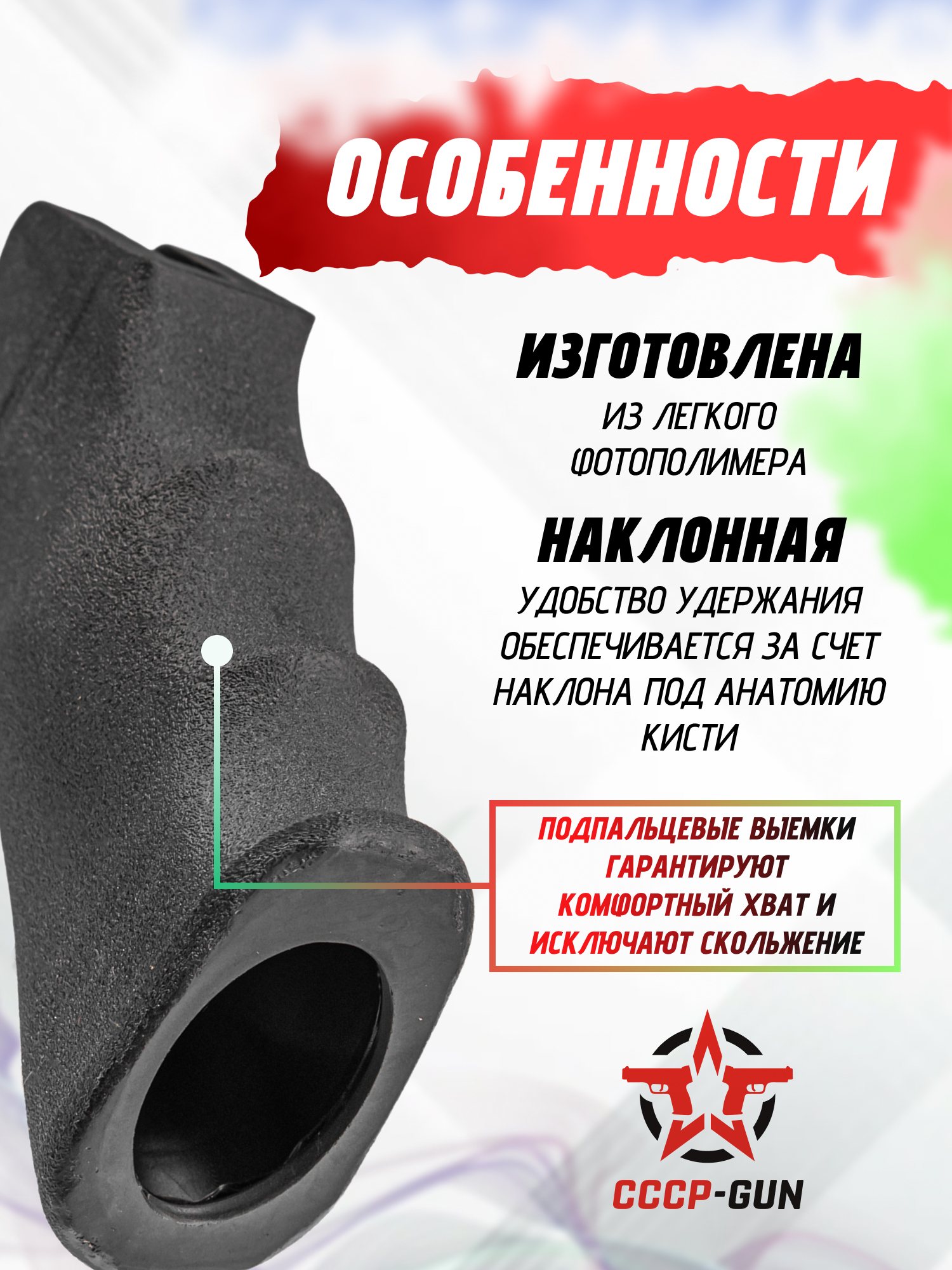 Геометрия рукояти Доберман отличается увеличенным углом наклона, такое положение не переутомляет кисть владельца и позволяет работать с винтовкой продолжительное время. Поверхность модели текстурированная и исключает проскальзывание во время выстрела даже при влажной ладони. Кроме того, на корпусе предусмотрены выемки под пальцы, они дают уверенный хват.
