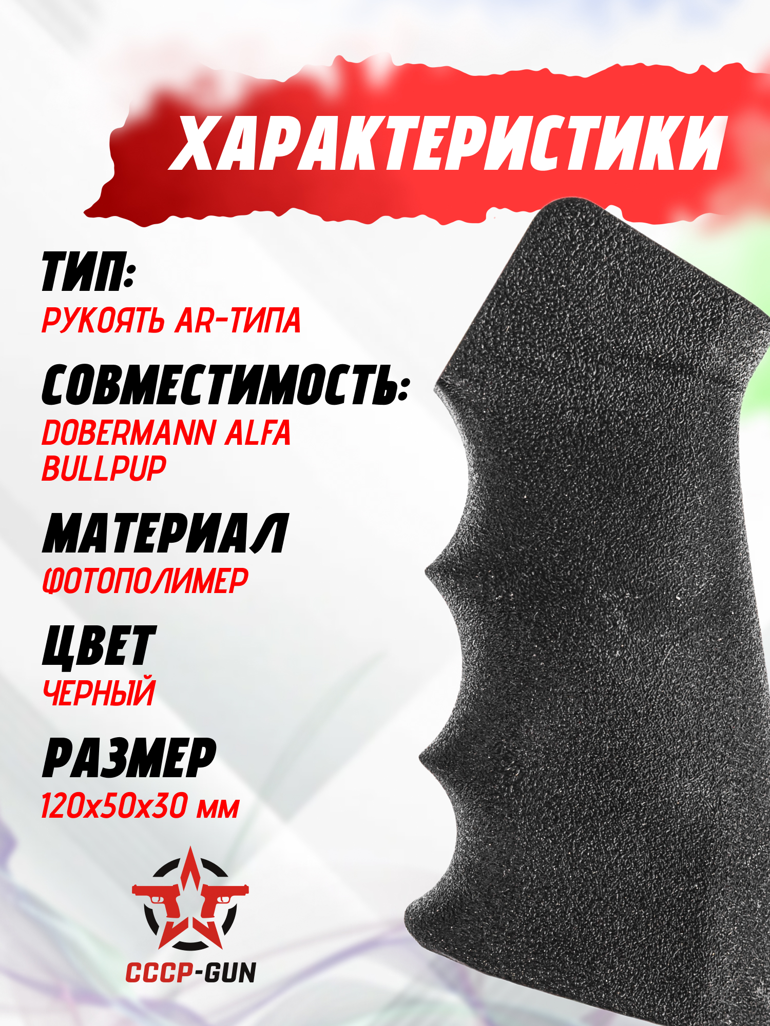 Таким изделием стала обозреваемая пистолетная рукоять, она создана для винтовок Alfa Dobermann Bull-Pup. Экземпляр имеет стандарт крепления AR-15 и фиксируется на корпусе с помощью специального винта под шестигранник и гайки. Замена штатного элемента на рассматриваемый может выполняться даже в домашних условиях.